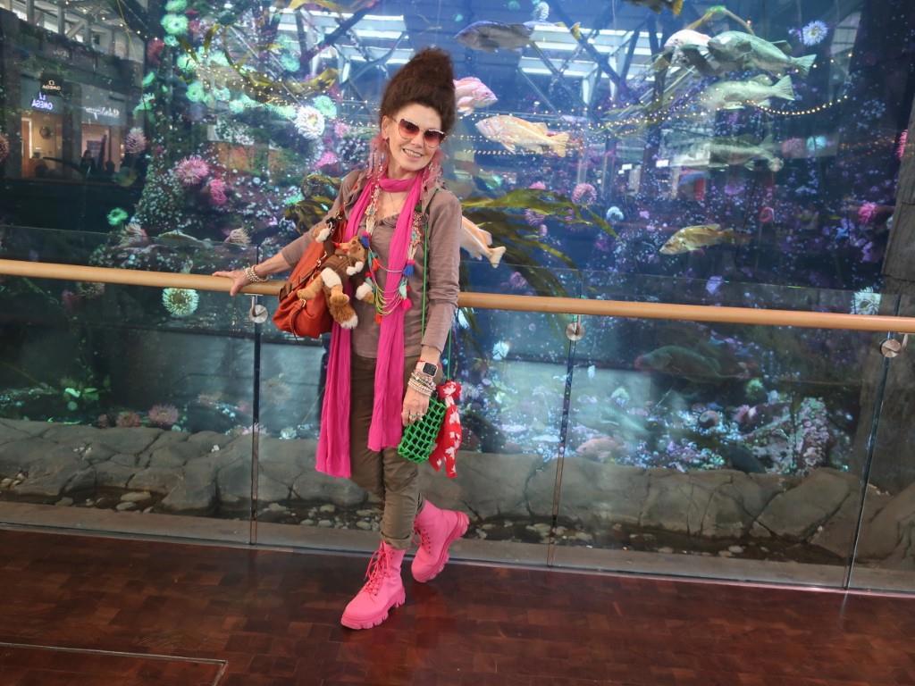 Традиционное фото у 40 000 литрового аквариума в аэропорту. Проверяем насколько надёжно прикреплён всегда путешествующий с нами лис к сумке - не убежит ли? Однажды пытался - еле нашли.