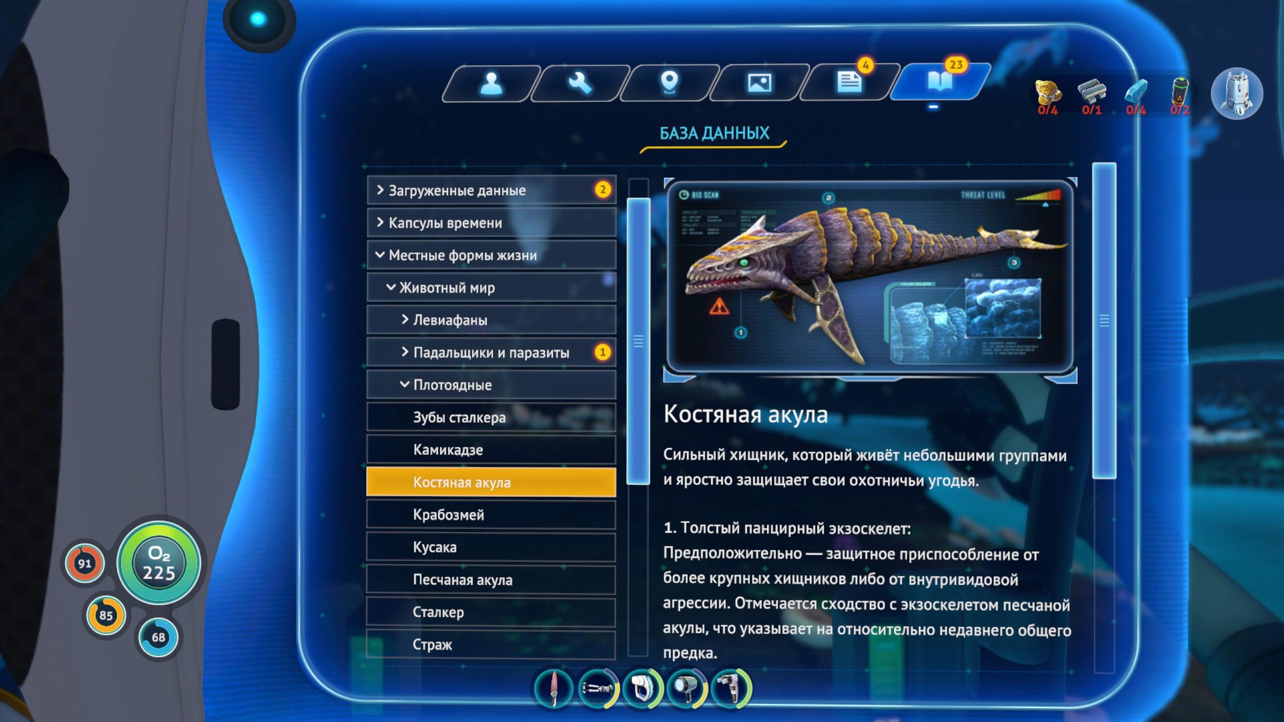 А чтобы игрок не расслаблялся, с летальным оружием в игре всё не очень весело. Ну, оно почти отсутствует, так-то. Нож (улучшающийся до термоножа), ядовитые мешочки, которые можно собрать с одной из мелководных рыб и дальше использовать в бою, руки и бур экзоскелета. Вот в общем-то и всё.