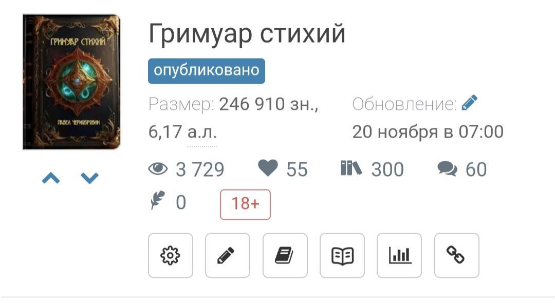 Во-вторых, мой «Гримуар стихий» добавили в библиотеку 300 человек. Спасибо всем, кто читает эту мрачную историю.