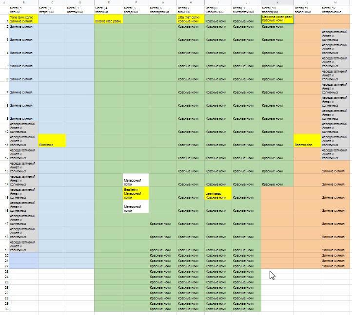 Над календарем в итоге я просидела не меньше недели. В результате сложных, но интересных вычислений у меня получилось несколько рисунков и гугл-таблица, куда я смогу поименно заносить моих героев, отмечать их местоположение и отслеживать, какую картину они видят сейчас вокруг себя и на небе: