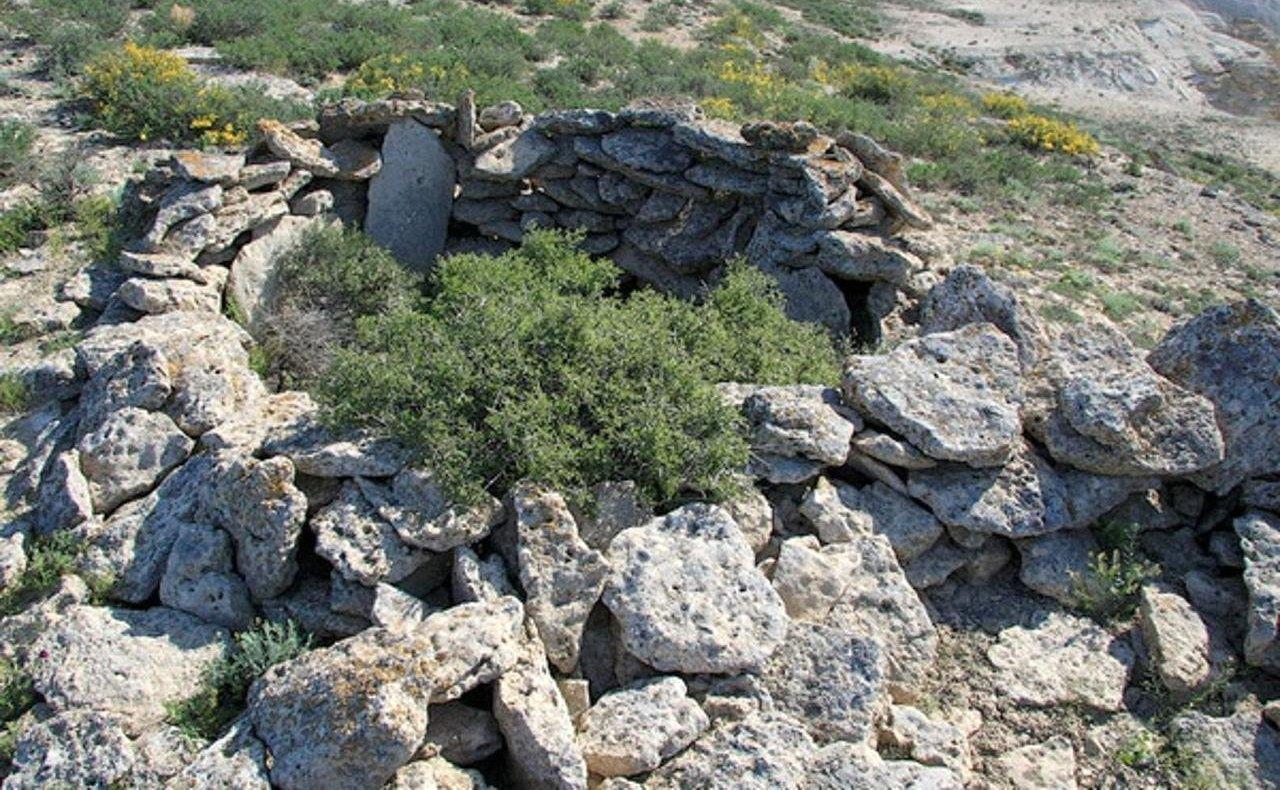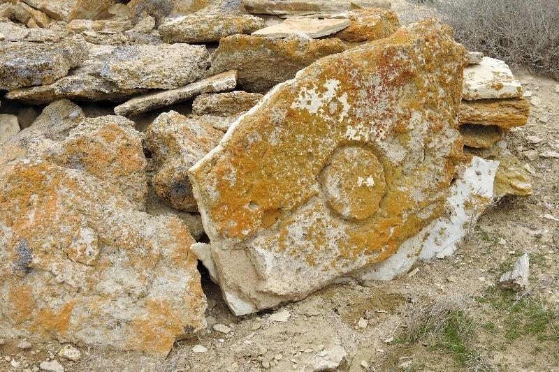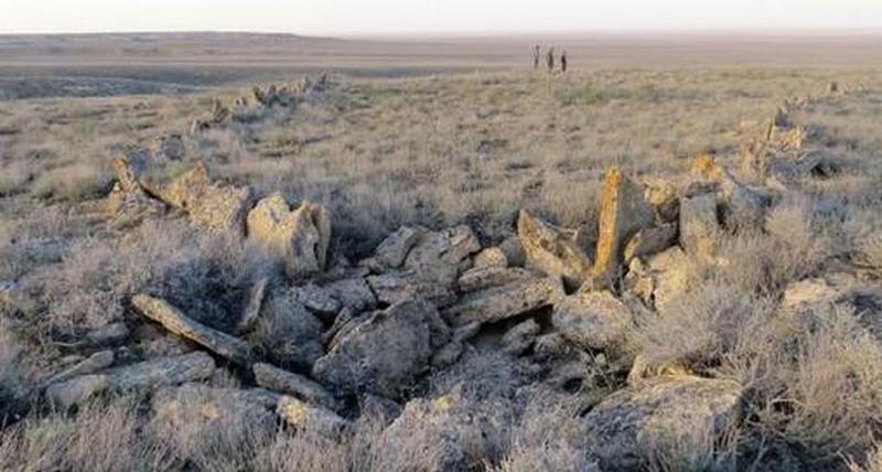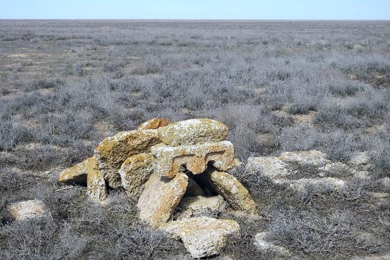 Мне одному кажется, что это здорово похоже на руническую надпись? Откуда взялись эти самые родовые «тамги»? Что это за следы «второго порядка»? Их нашли совсем недавно, но уже сейчас некоторые из них широко известны, но вот только увидеть их легко и просто уже не получится. Например, упоминаются многочисленные статуи, найденные в 1983 году на западе плато Устюрт в районе колодцев Бейте, изображающие воинов невнятной национальности. Что это были за люди – не совсем понятно. Подозревают, что это – массагеты (3-4 век до н.э.), которые упоминаются в очень сомнительном источнике, известным как «Геродот». Но вопрос, как говориться «подвесили», хотя он важен хотя бы потому, что наблюдается некоторая преемственность в надгробных памятниках более позднего периода. Есть странности и менее очевидные. Вот, например, могила, которой вряд ли больше 200 лет. Иначе бы её уже занесло песком. Однако присмотритесь – один из камней явно является обломком от хорошо обработанной детали более старого сооружения: