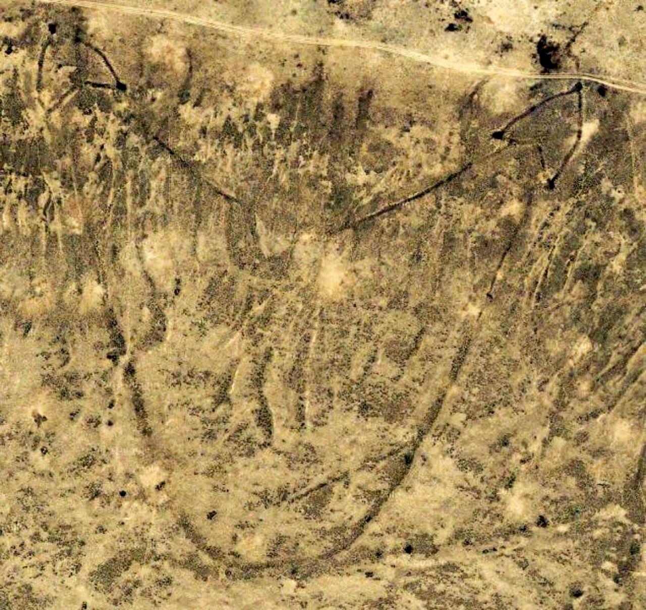 Говорят, что они начинаются от мыса Дуана в Аральском море, а вот где кончаются, пока не ясно. Если подняться ещё повыше, то можно увидеть таких стрел много. Вот столько, например: