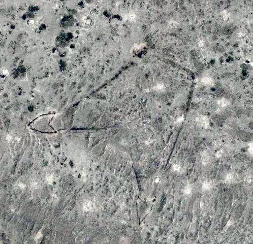 Представьте себе огромные стрелы, нарисованные на земле. То есть не нарисованные, а выложенные камнями. Хотя зачем представлять? Вот фотография такой парной стрелы с воздуха:
