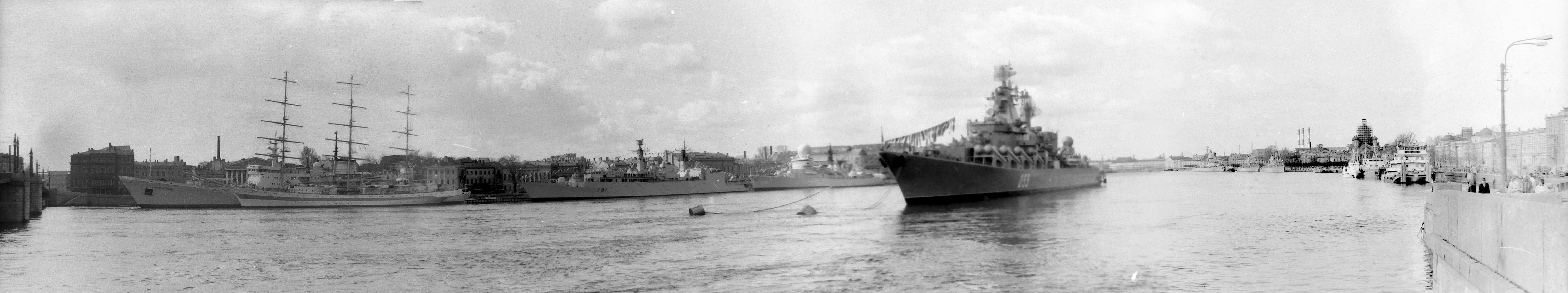 Панорама Невы с иностранными кораблями (это был день ВМФ). В центре - наш "убийца авианосцев" (кажется, "Маршал Устинов"):