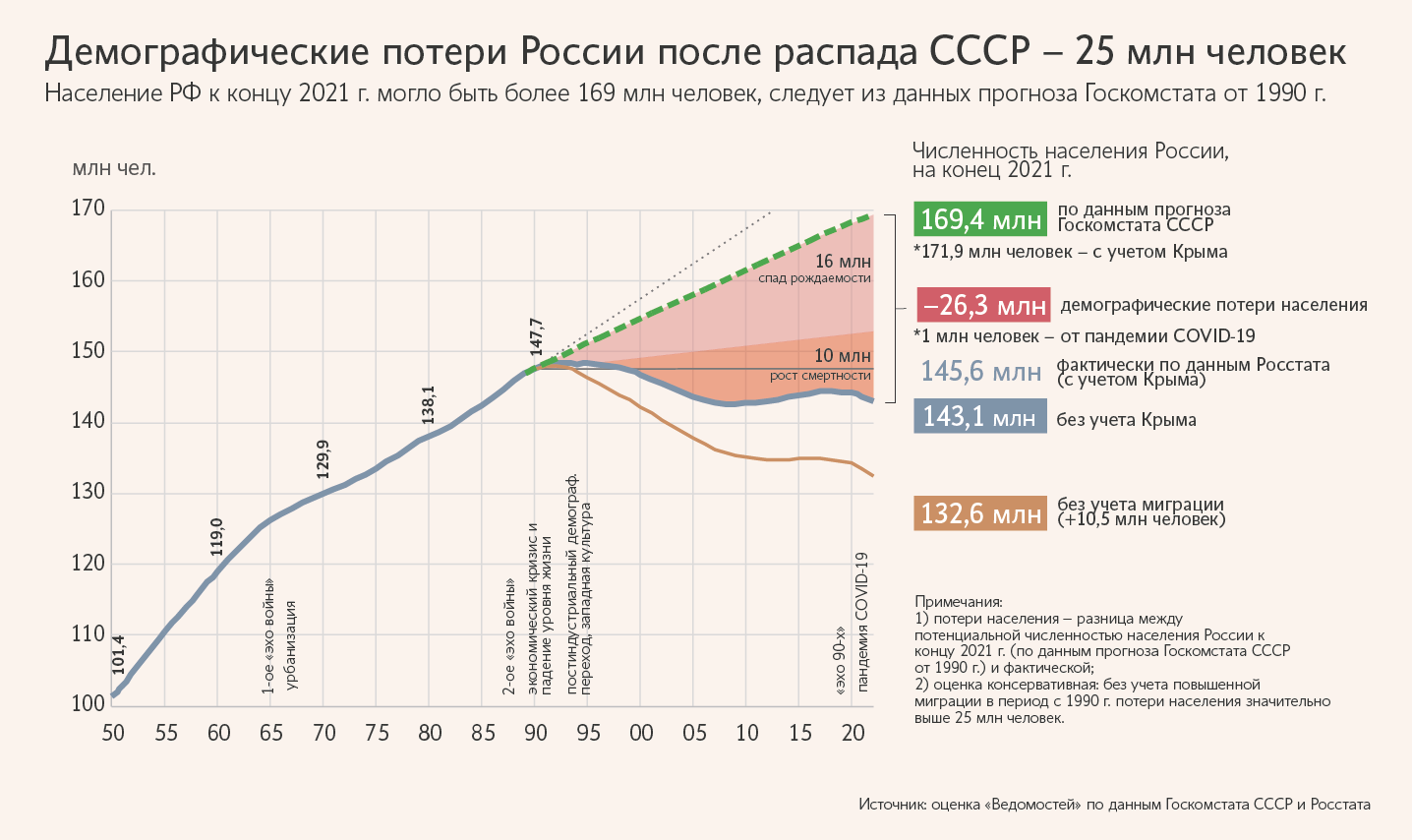 По всему Союзу в целом общий рост населения к концу 2021 г. мог составить 72,8 млн человек – до 364 млн человек, следует из прогноза Госкомстата СССР. Фактически численность стран бывшего Союза к концу 2021 г. оказалась всего 299 млн человек.