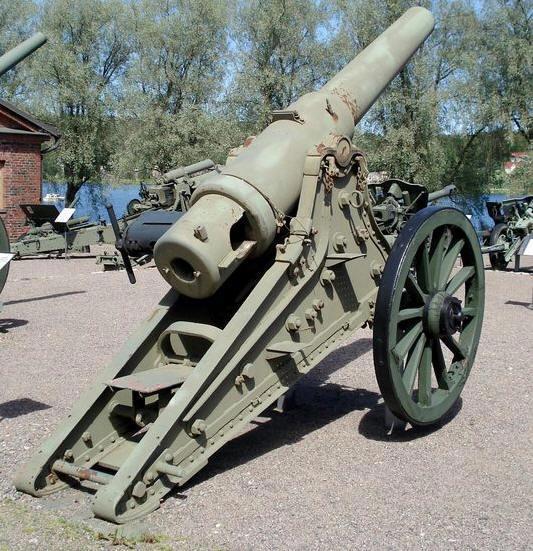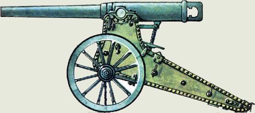 42-линейная осадная пушка образца 1877 года. Масса снаряда — 16,38 кг, начальная скорость — 426,7 м/с, длина ствола — 3745 мм, масса орудия в боевом положении — 1300 кг.