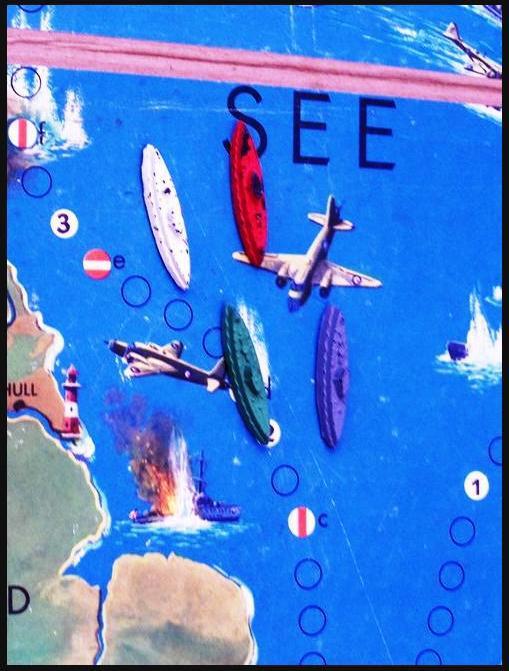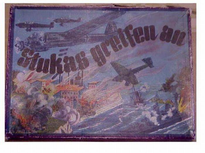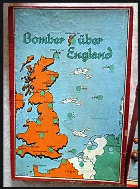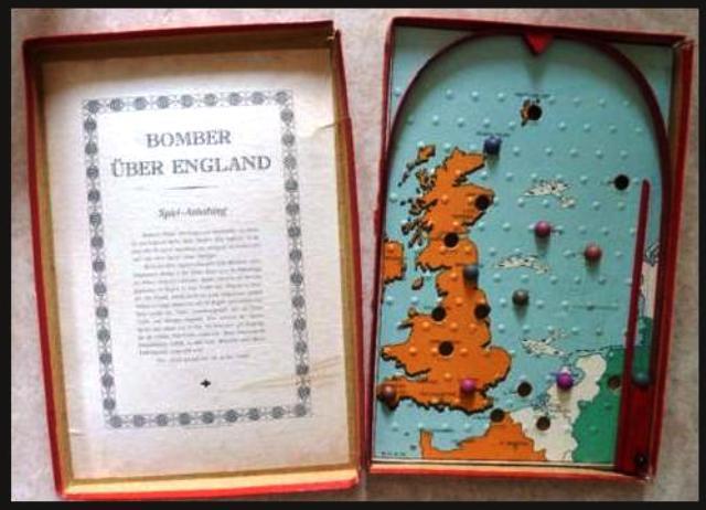 В 1940-м Рейх готовился к операции "Морской лев" — вторжению в Британию. Люфтваффе вовсю бомбило английские города и заводы. В это время в немецких магазинах появилась игра "Bomber über England". Правила были простыми: на игровом поле в виде фрагмента карты Европы были лунки, отмечающие города и прочие цели. Двое игроков по очереди "стреляли" шарики-бомбы при помощи пружины. За каждую попавшую в британский "город" игрок получал баллы, за попадание в местность под немецкой оккупацией терял