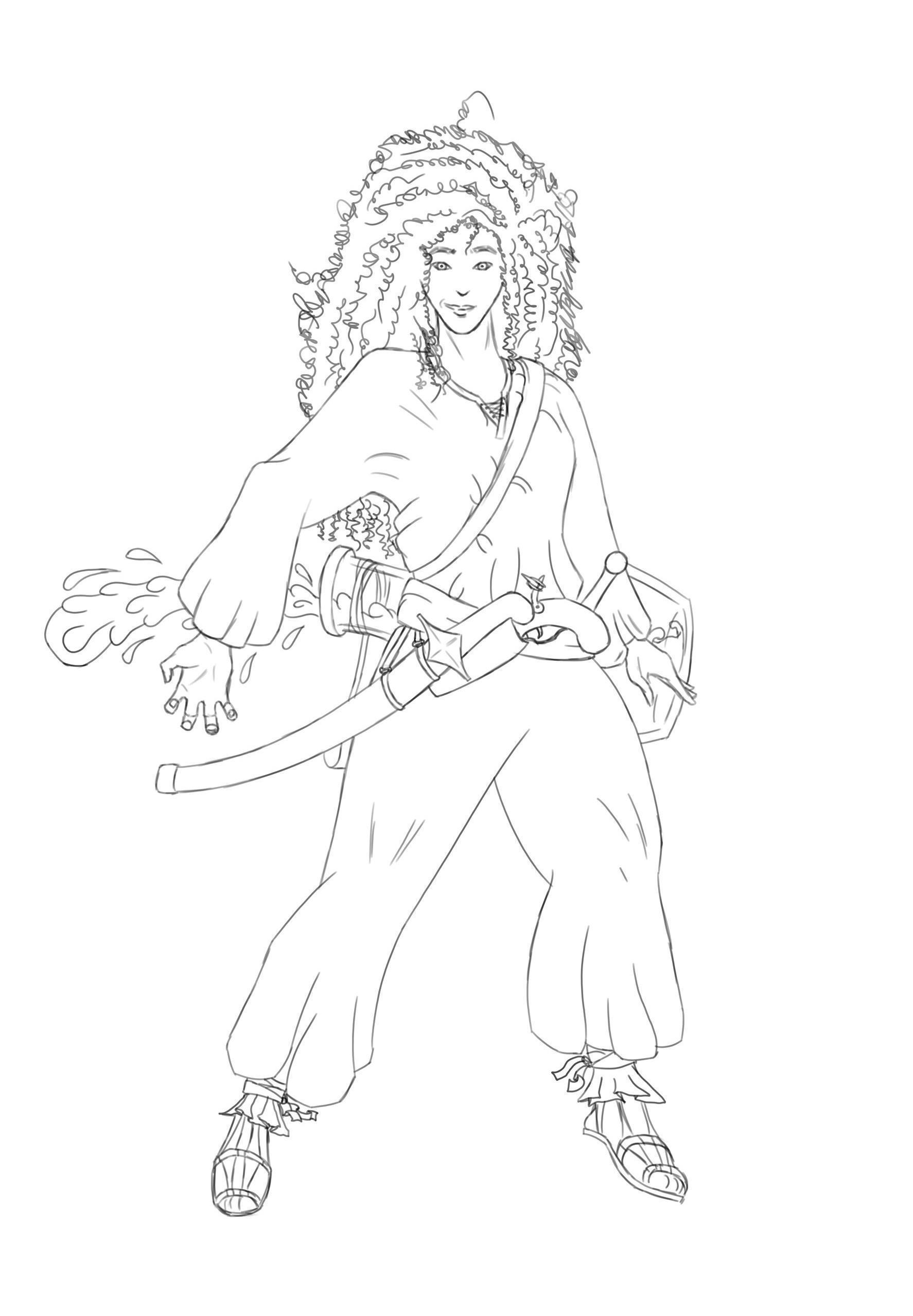результатом я остался мягко говоря недоволен. Я вообще-то Мастера воды из Болунтура рисовал! А что вышло? Всё у меня было скучно, от деревянной позы, до мочалки вместо волос, от воды которая похожа чёрт знает на что, до снаряжения, ни разу не сбалансированного по композиции. А ведь я сам в каком-то из постов о насмотренности говорил! Я ведь знал, что могу лучше! В общем, я не выспался той ночью. И утром сразу продолжил работать над рисунком.