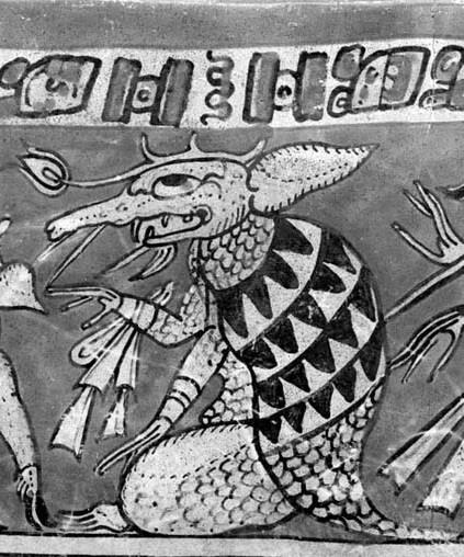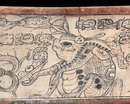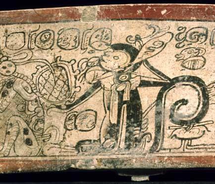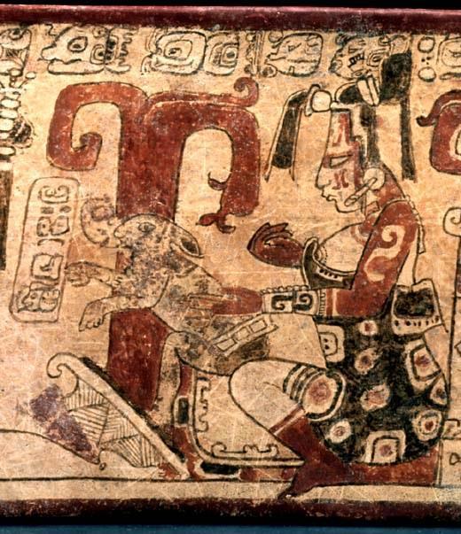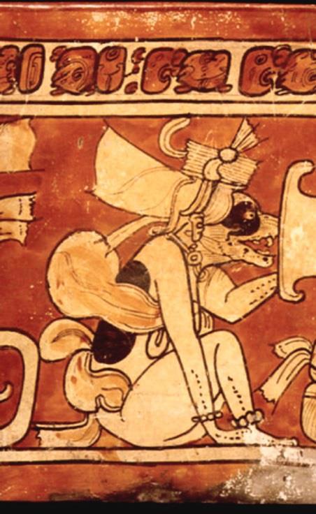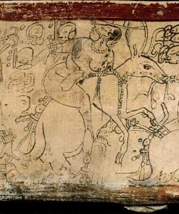 Юкатанский олень. По легенде, один из героев-близнецов превратился в оленя, привлёк жену старого бога охоты и увёз на спине. Этот сюжет изображён на сосуде.