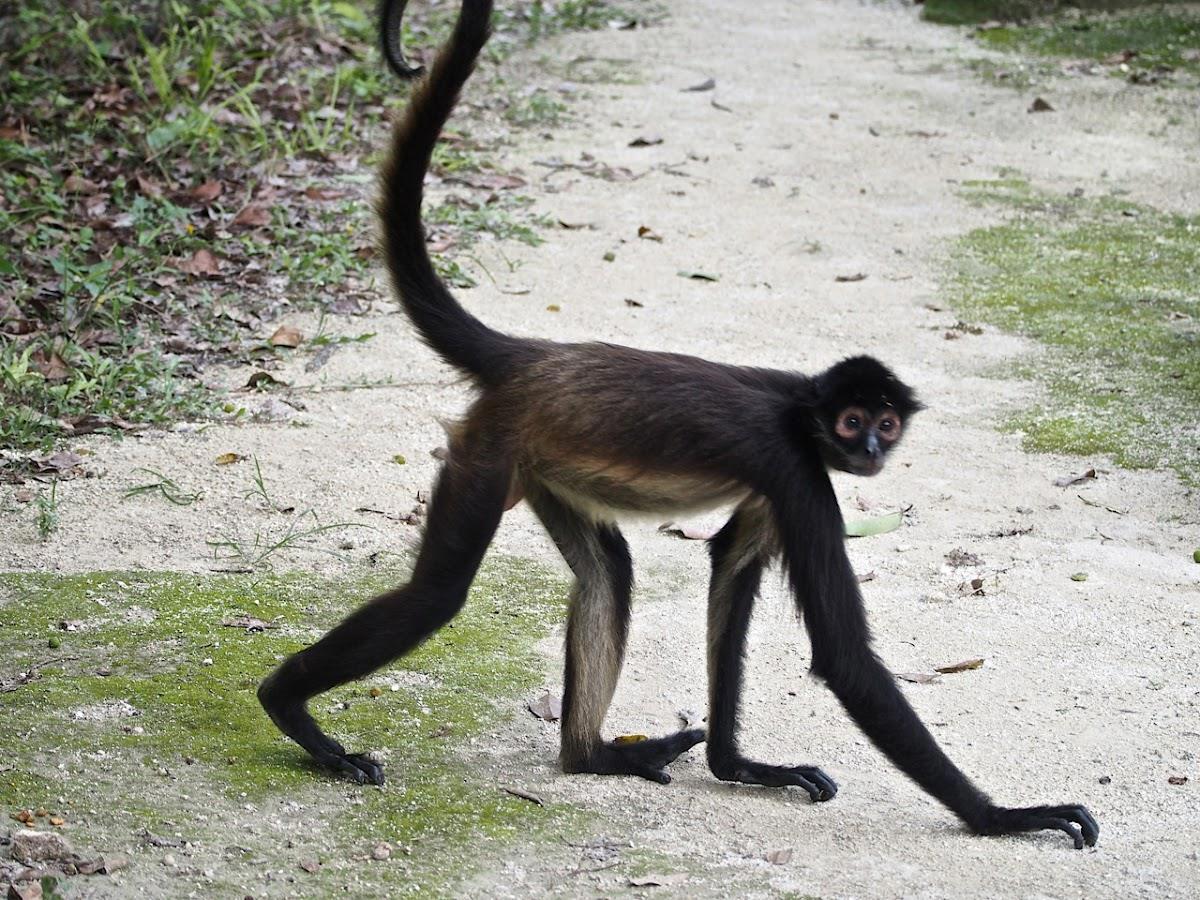 Паукообразная обезьяна. Она держит барабан из панциря черепахи и бьёт в него колотушкой.