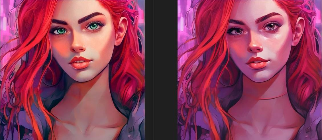 После того как иллюстрация готова, я обрабатываю ее через приложение Remini, которое использует нейросетевые алгоритмы для улучшения качества изображений. Remini особенно эффективно работает с лицами и глазами. И на заключительном этапе, при необходимости, делаю легкую ретушь.