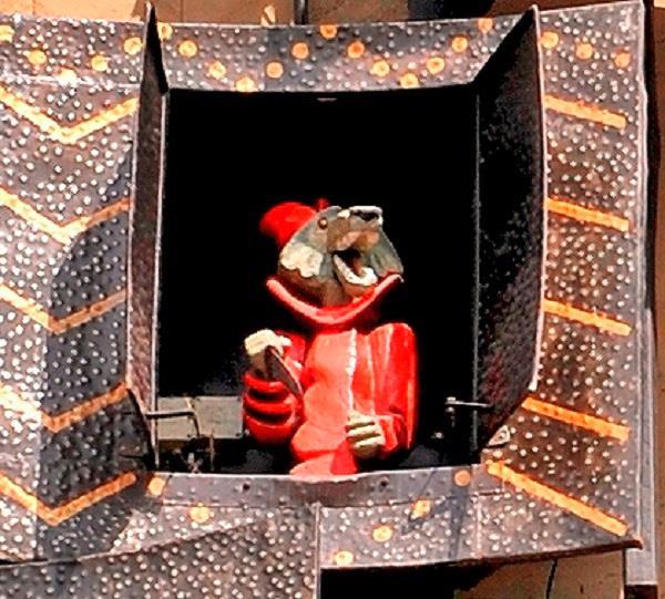 Местные завсегдатаи шутили: "Это он закуску закончил нарезать. Водочку ему сейчас принесут, а к обеду, как всегда, поросеночка подадут". Дело в том, что окна в замечательных часах открываются в следующей последовательности: 1:00 – осел, 2:00 – сова, 3:00 – попугай, 4:00 – заяц, 5:00 – лиса, 6:00 – обезьяна, 7:00 – кот, 8:00 – баран, 9:00 – бобер, 10:00 – коза, 11:00 – волк, 12:00 – поросенок. Соответственно, на “час совы” (14:00) в гастрономах приходился обеденный перерыв, в 15:00 наступал также радостный “час попугая”, а конец веселью объявлял кот в 19:00.