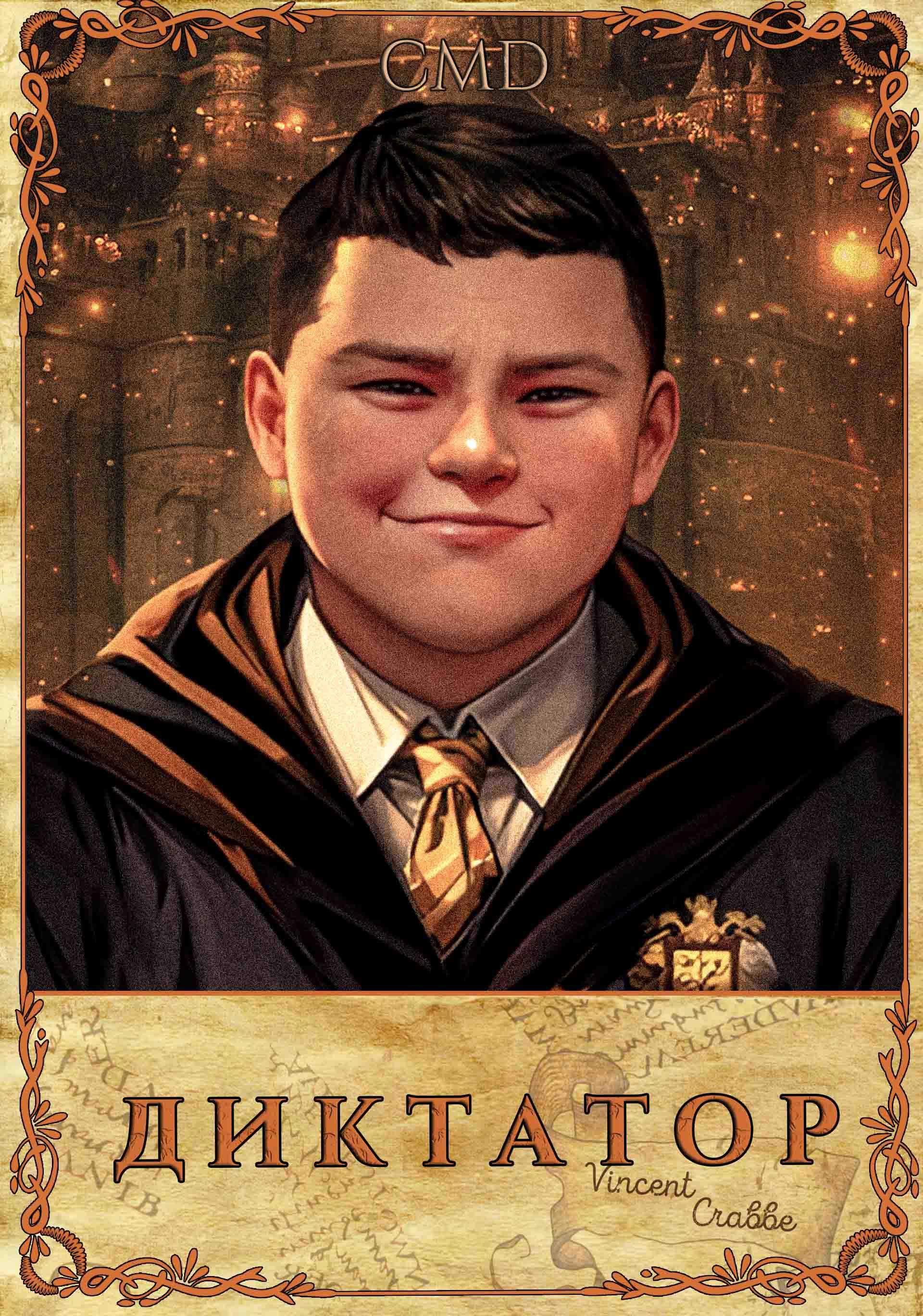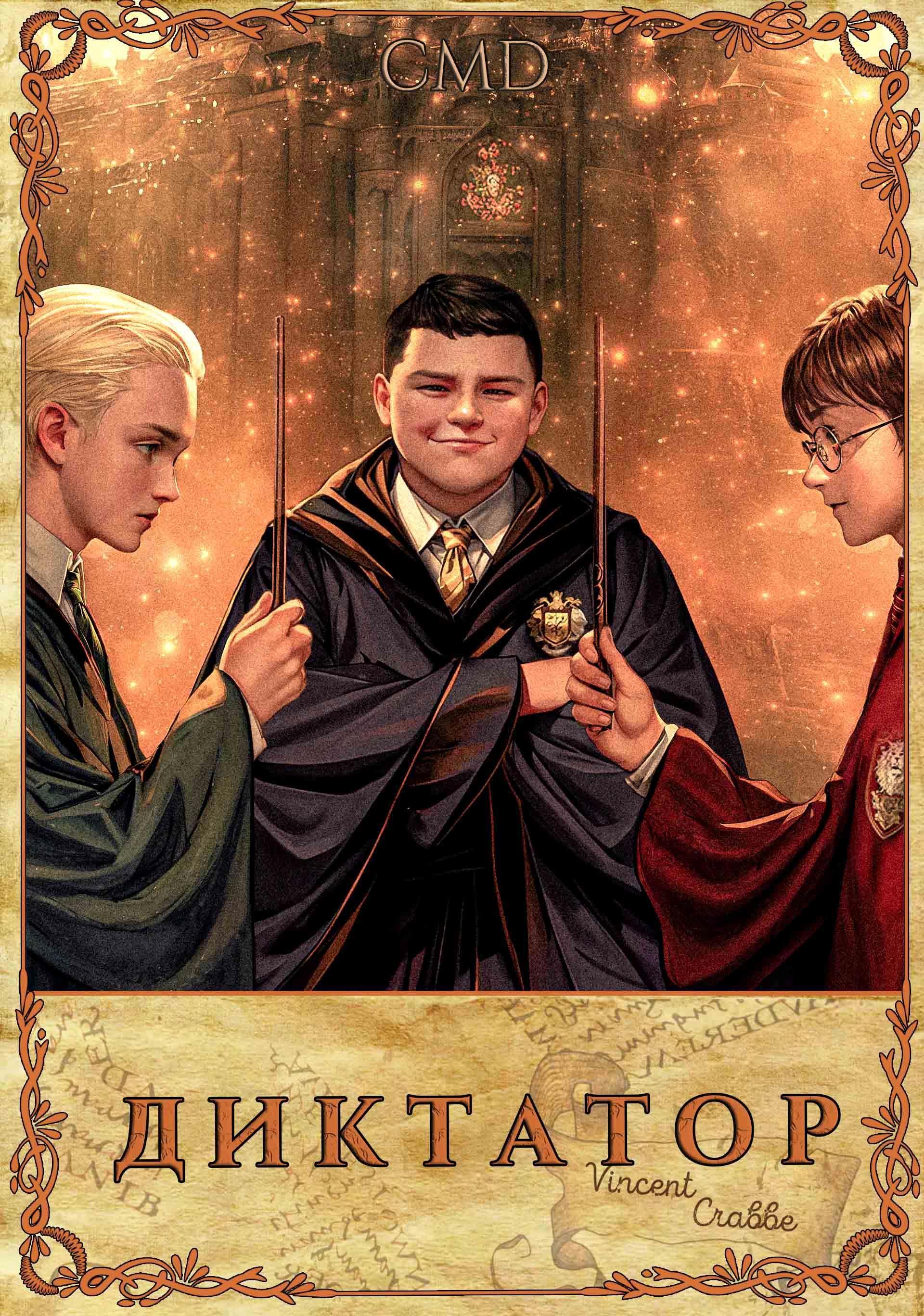 Произведение я не читал - а там, извините меня, 160+ а.л. и ещё пишется - поэтому работал по детальному ТЗ. Ну, и я немного, как обычно, выборочные куски почитал. Фик интересный - попаданец, наш, да ещё и в тело Винсента Крэбба. Насколько я понял из текста, попаданец - русский, довольно взрослый (если не старый уже), и хорошо знакомый с каноном ГП. Собственно, поэтому он и изображён с такой довольной ухмылкой - мол, сейчас я всем тут рога пообломаю... Однако, судя по общению с автором, всё будет не так радужно. Но Крэбб об этом не знает, поэтому и улыбается, как пришибленный.