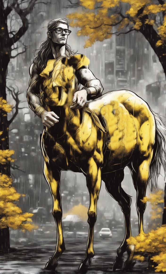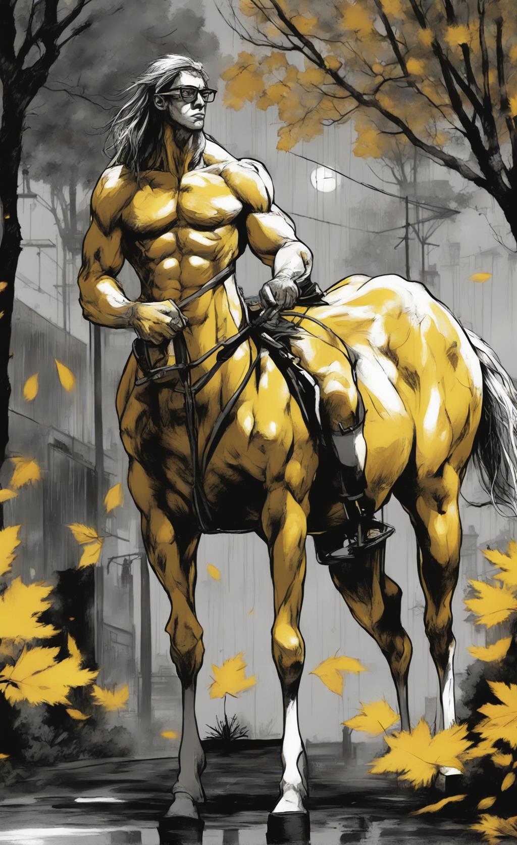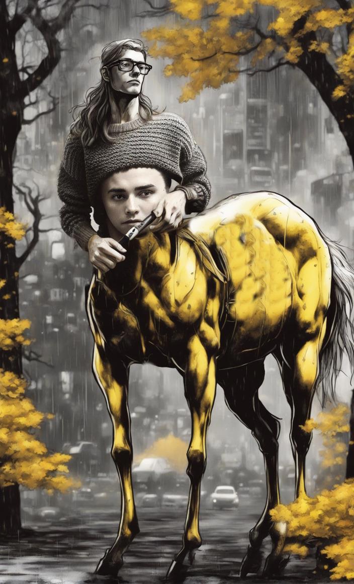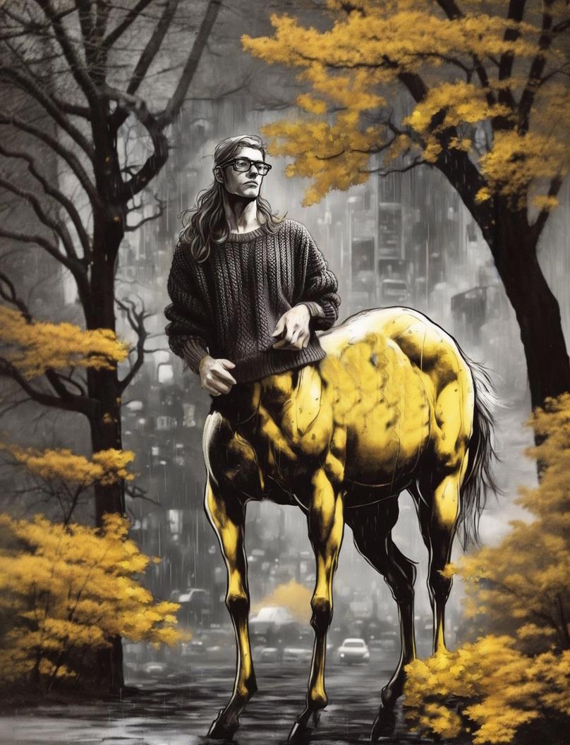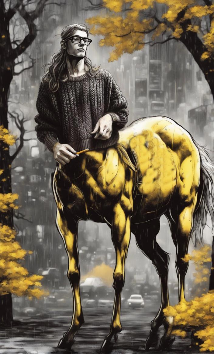 Итак, в данном случае требования у меня были такие. Стиль, близкий к стилю комикса или книжной графики, карандаш или перо, подтонированные акварелью. Не хочу, чтоб он был узнаваемый, "в манере кого-то" - вернее, хочу, чтобы он был узнаваемо мой. Жёлто-серый колорит поздней печальной осени. Кентавр - этакий городской интель в очочках, может, малость хиппи. Почему-то хочу, чтоб в свитере - а свитер на кентавра надеть, сцабака бешеная, практически невозможно. На этом деле, оговорённом в промте, нейросети выдают такое неприличие, что и показать-то срамно: