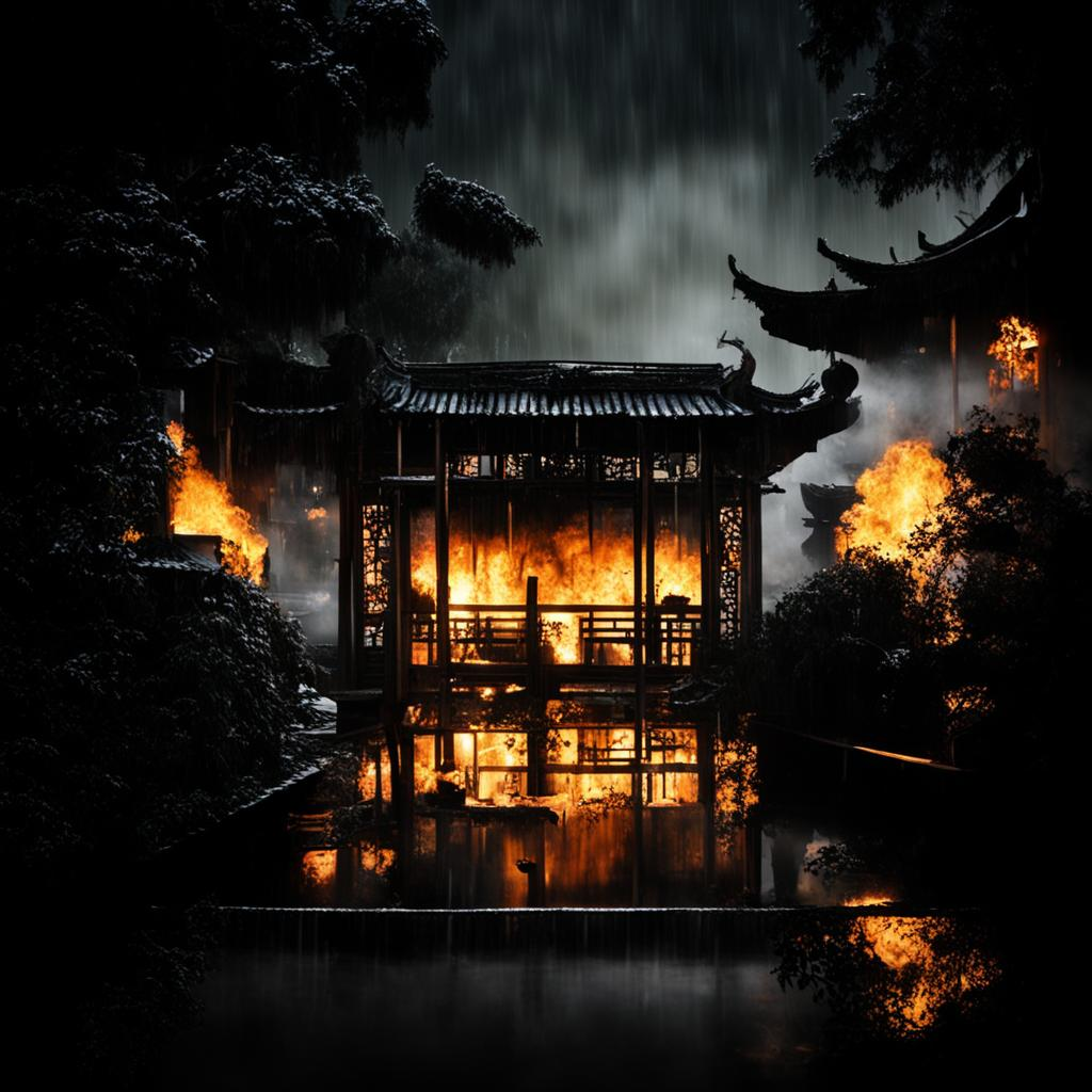 Шанкар увидел. Тот же сад... Пруд с цветами лотоса, источающими терпкий аромат. По поверхности воды шлепают крупные капли. Дождь барабанит по листьям сливы. Тропинка, выложенная щебнем, сверкает в ночи... Но почему? Откуда свет? Ведь звезды скрыты за серыми тучами... Всполох огня. Пламя пожара поднимается ввысь. Слева. Справа. Впереди. Свет от него играет на влажных поверхностях. Шанкар переводит взор вниз, к подножию сливы...