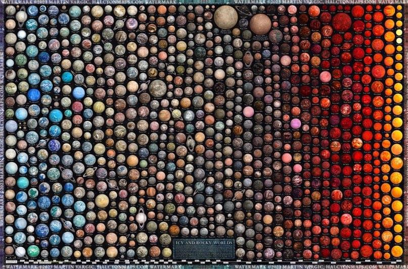 900 миров... Это визуализация ледяных и скалистых экзопланет.