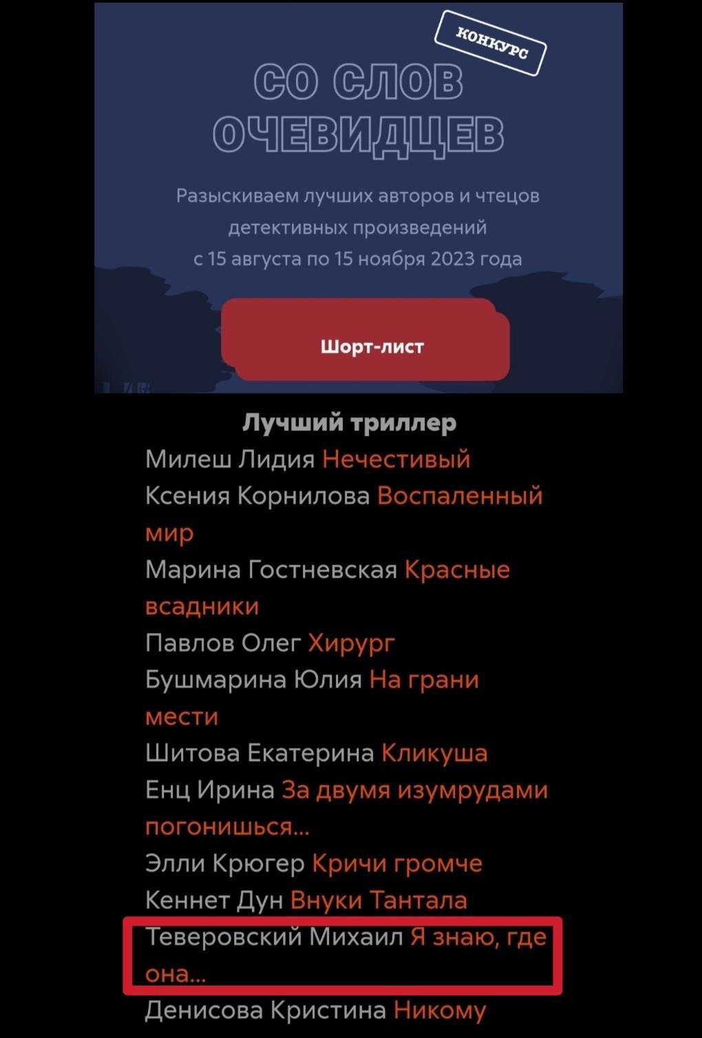 Автор: Теверовский М. Г.Друзья! Позавчера объявили шорт-лист литературного конкурса "Со слов очевидцев". Мой психологический триллер "Я знаю, где она..." в финале!