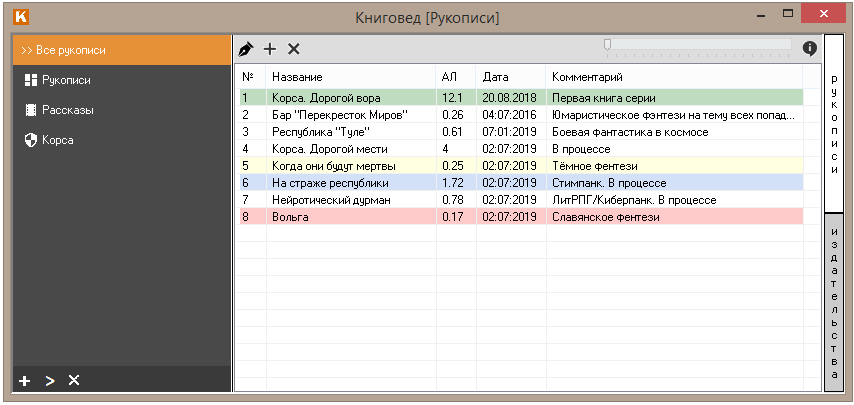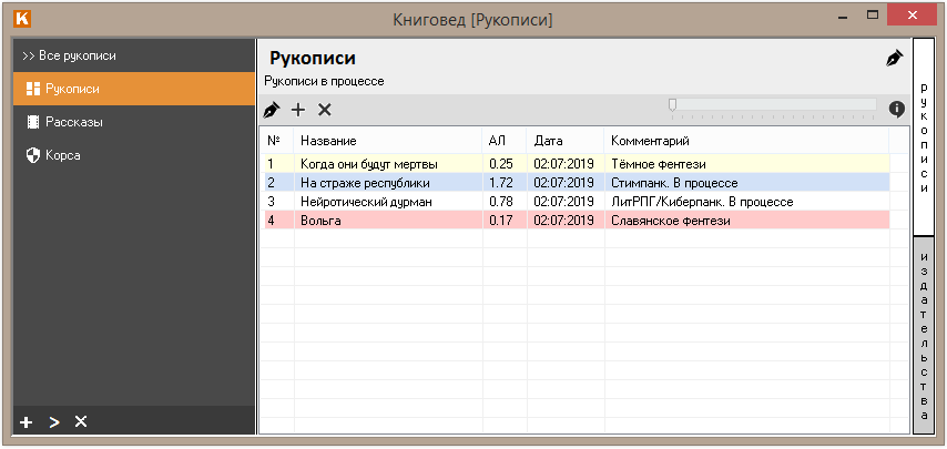 Два рабочих поля: рукописи и издательства. Можно создавать категории, в рукописях есть отдельное текстовое поле для категорий.