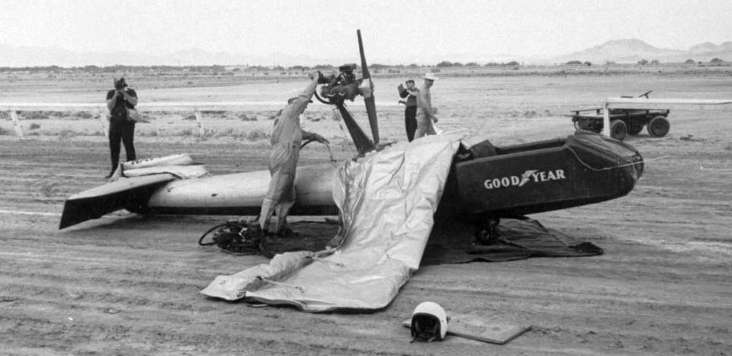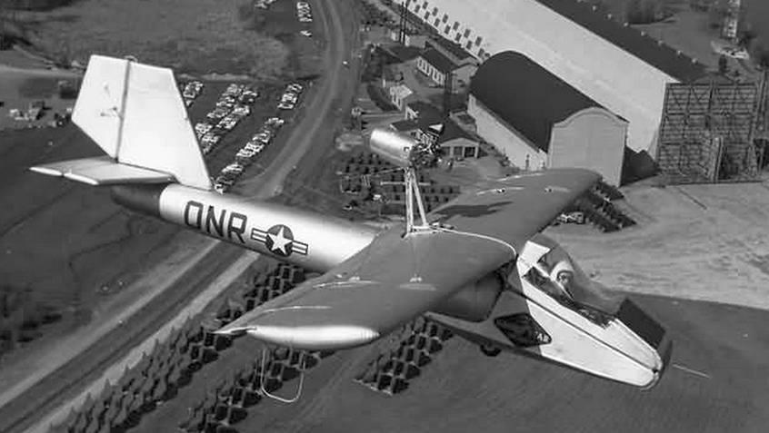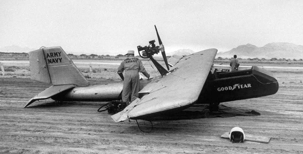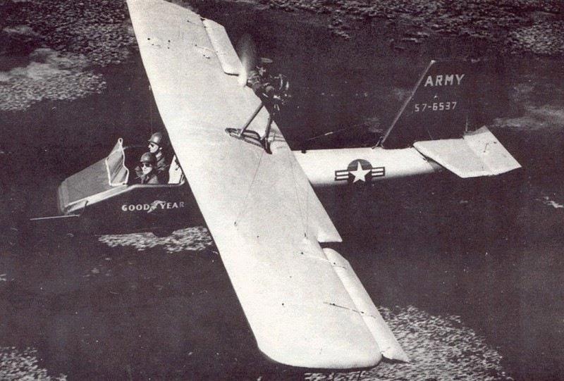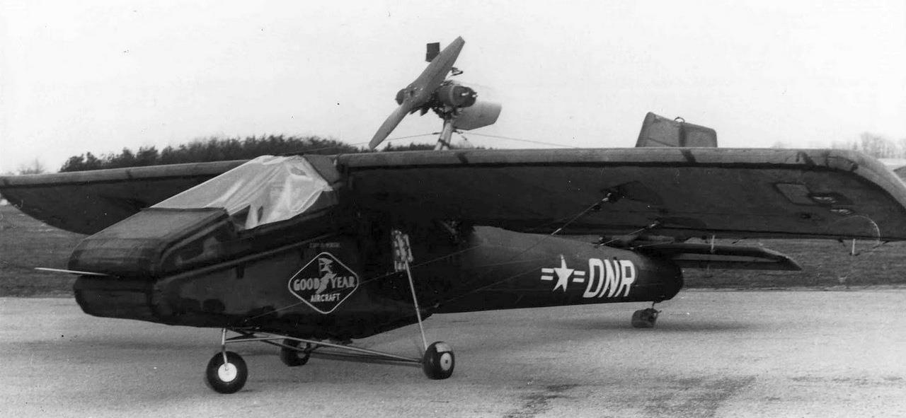 Однако не всё так просто. Не одному Гроховскому приходили в голову «шальные мысли». Была в США небольшая компания, которая занималась изготовителем аэростатов и дирижаблей под названием Goodyear. Её конструктор Тейлор Макдэниел в тех же 30-х годах предложил создать надувной планер. Правда тогда дальше дело так и не сдвинулось с мёртвой точки. Но к идее всё же вернулись в середине пятидесятых. Всё та же Goodyear предложила новый проект Министерству обороны США. Первым делом придумали красивое название (чисто американская фишка). Если у нас чаще всего звучало легкомысленное «дутик», то у американцев это стало называться Inflatoplane. Хотя, с другой стороны, в переводе это звучит всё же не очень романтично – «надувной самолёт». Но не только это, разумеется. Конструктора вновь созданной Goodyear Aircraft Company на основе идей Макдэниела создали оригинальную смешанную конструкцию со стальным разборным каркасом и надувными элементами. Иные времена – иные материалы. Самолёт американцев был сделан из новейшего перспективного многослойного материала под названием Airmat. Кроме того, внутри надувных оболочек установили усиливающие элементы из нейлоновой сетки. Первый вариант самолёта имел открытую кабину для пилота и выглядел вот так:
