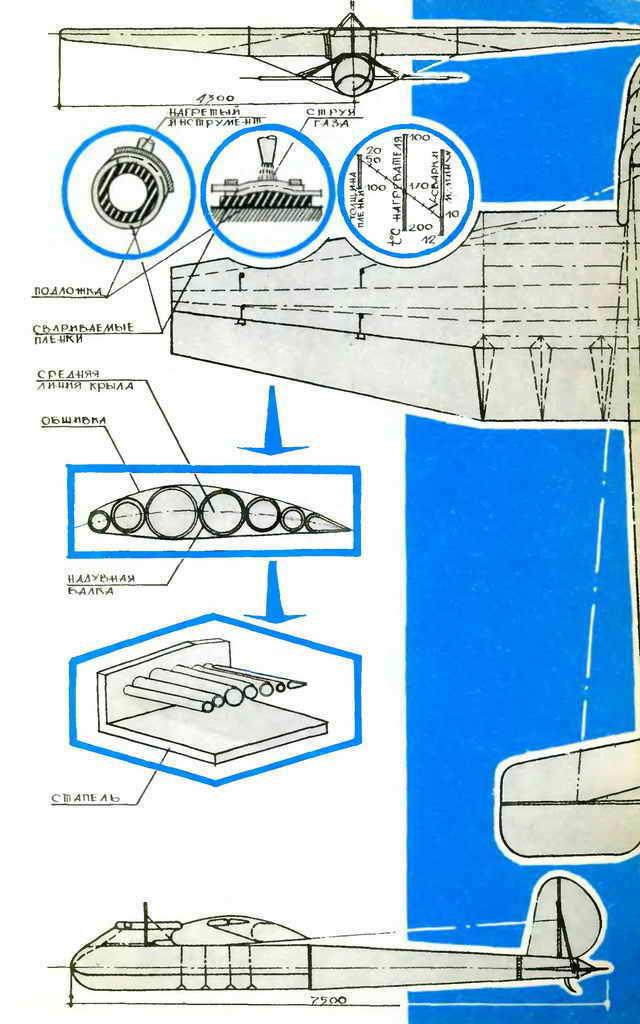 К маю 1936 года готовность составляла 35 процентов. Что случилось дальше – не известно. Вся документация сгорела в результате налёта авиации во время блокады. До наступления «демократизации» что-то ещё было найти, видимо можно. Поэтому в журнале «Юный техник» в своё время появилась вот такая схемка, показывающая общее устройство надувной летающей лодки:
