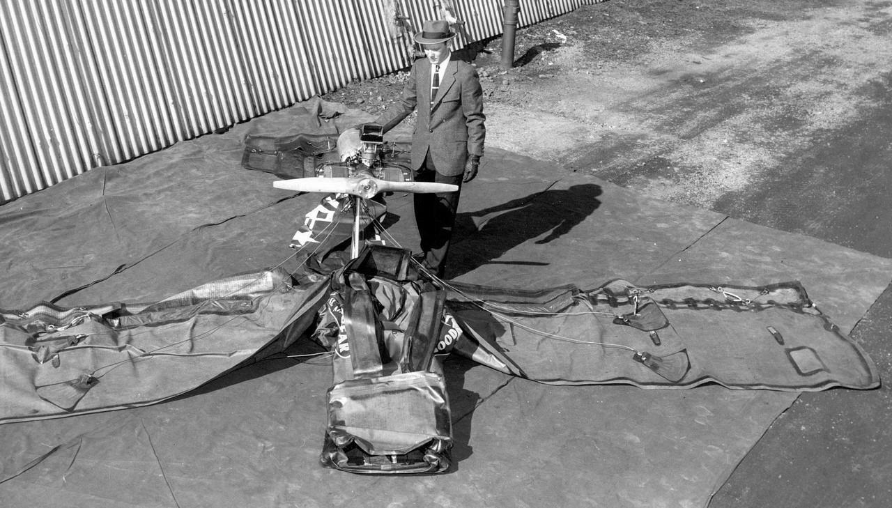 Как видите, это уже был вполне полноценный самолёт. На него сначала установили двигатель мощностью 40 л.с. Надувать конструкцию можно было или компрессором, или даже ручным насосом. Однако лучший вариантом было использование специального баллона со сжатым газом. Давление было относительно небольшим – 1,7 атм. В походном положении самолёт занимал очень немного места и мог поместится в багажнике легковушки. Топливный бак ёмкостью 76 литров должен был обеспечивать продолжительность полёта до 6 часов. Эту первую, опытную машину построили в 1956 году. Образец получил марку GA-33. На фото сборка самолёта до начала надувания выглядела вот так: