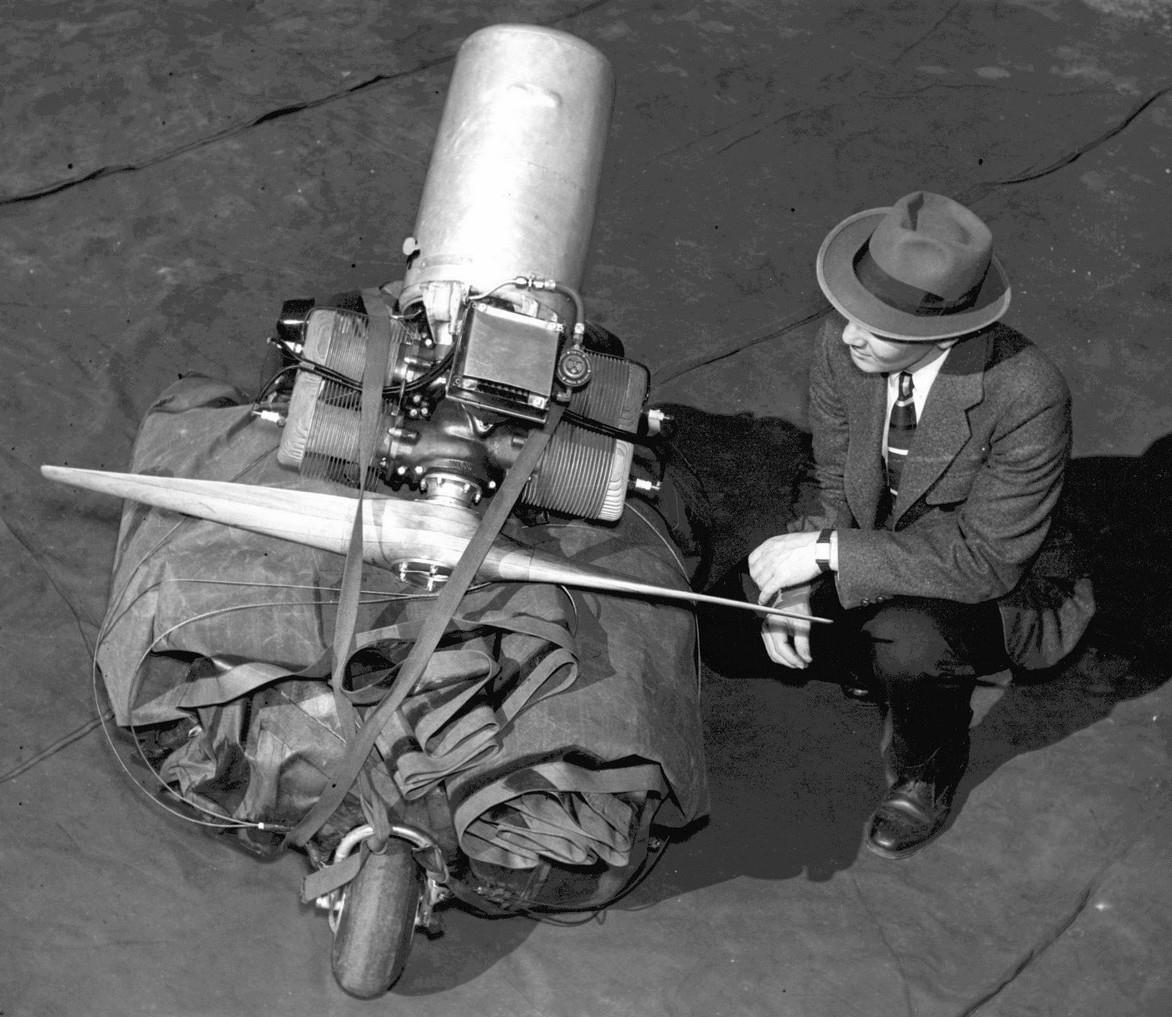 Я про настоящие надувные самолёты. Пожалуй, первым подумал об этом Павел Игнатьевич Гроховский. Реальную работу в этом направлении он начал в 1934 году с проектирования надувного планера. Сами творцы называли опытную конструкцию «резиновым крылом». Использовать её предлагалось «горными десантниками». После использования «крыло» можно было свернуть и упаковать в рюкзак. Масса приспособления была около 20 кг. В рабочем положении крыло крепилось на десантника с помощью ремней (к сожалению, ни одного изображения мне найти не удалось). Думаю, что это было что-то вроде дельтаплана. Первым испытателем устройства стал планерист Иван Петушков. Взлёт осуществлялся из кузова грузовика, и полёты прошли достаточно удачно. Один раз при приземлении испытатель не удержал равновесия и упал на крыло. Он даже синяков не получил – надувная конструкция самортизировала.
