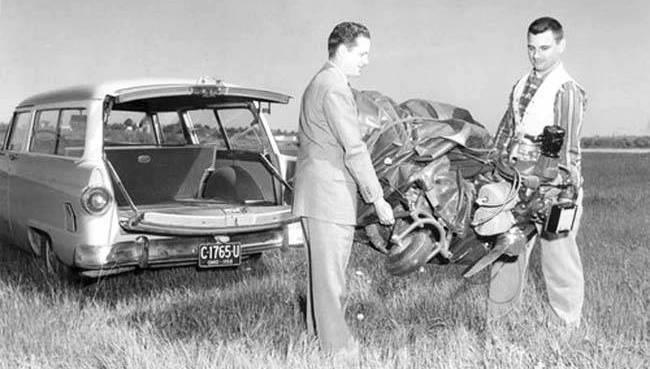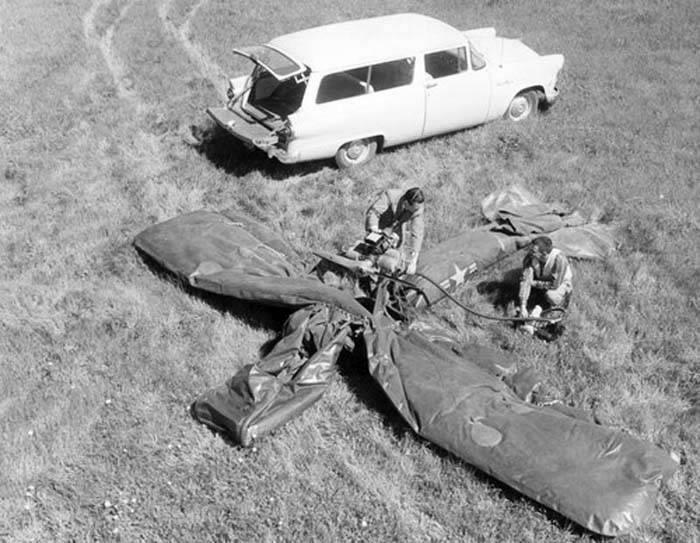 Наверное, у вас уже возникли вопросы типа – а почему вдруг вспомнили про довоенное предложение? И почему вспомнили именно военные? И почему именно в это время, а не в какое-то другое. Дело было в особом миротворчестве США, которым эта страна отличалась практически всю свою историю (да бить было некому, а нам некогда). Вот и начали сыпаться на корейскую землю американские экипажи «летающих крепостей» и прочей миротворческой техники. Самой дорогой деталью этой техники был как раз экипаж и его было нужно спасать. Для этой цели старались использовать всё, что было возможно. Хотя лучше всех себя показали вертолёты. Но всё равно – потери росли и вертолётов тоже. Нужны были новые решения. Вот и подумали в военном министерстве – а почему бы не сбрасывать пилотам надувные самолётики? Ведь там же пилоты. Вот пусть сами и вылетают… Поэтому новые модели «инфлатопланов» в походном положении стали укладывать в специальный контейнер объёмом 1,25 кубометра.