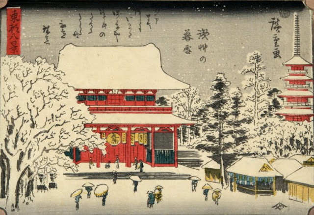 Хиросигэ Вечерний снег в Асакуса.