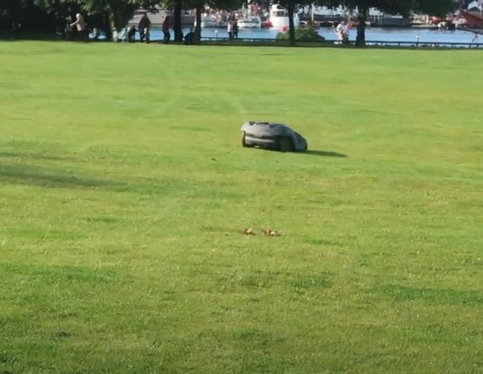 По газону без присмотра ползает автоматическая косилка, и никто её не спёр!