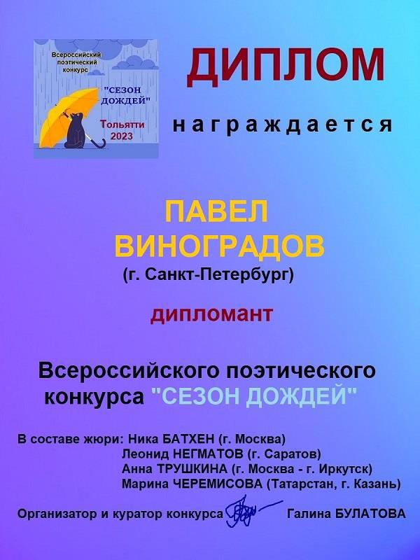 А приехав домой и зайдя в интернет, обнаружил, что моё стихотворение "Донна" получило диплом поэтического конкурса "Сезон дождей", организованнго сообществом "Поэзия Тольятти"!