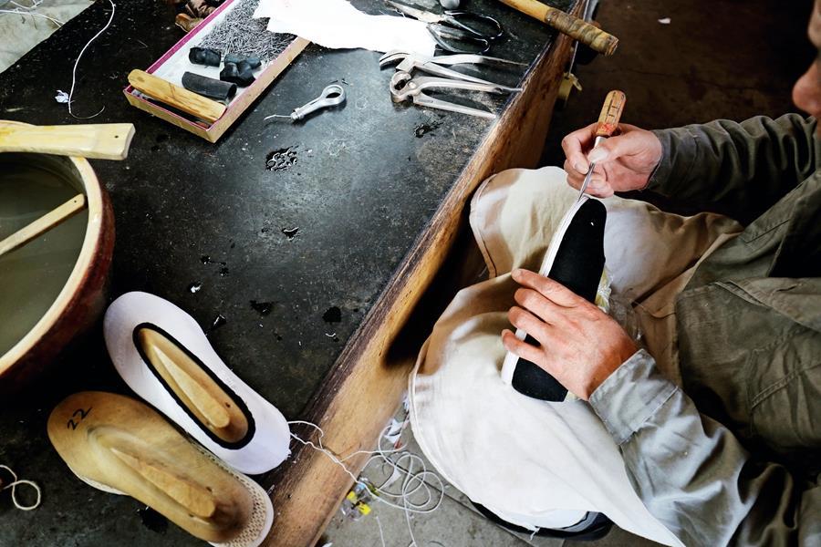 на фото: Хорошие матерчатые туфли циенцэнди должны держать форму и красиво выглядеть. По этой причине необходима строгая последовательность в их изготовлении. Кроме того, чтобы результат получился высокого качества, очень важны дополнительные операции по отделке и приданию туфлям нужной формы с помощью специальных и инструментов.