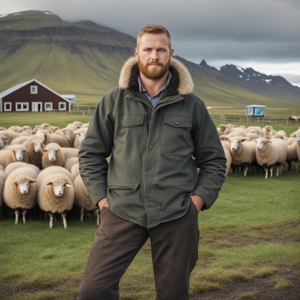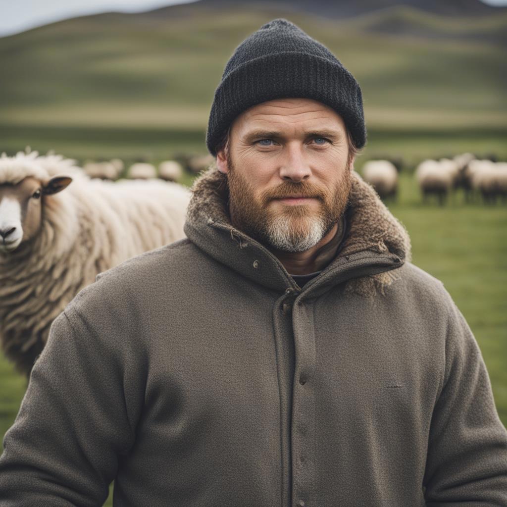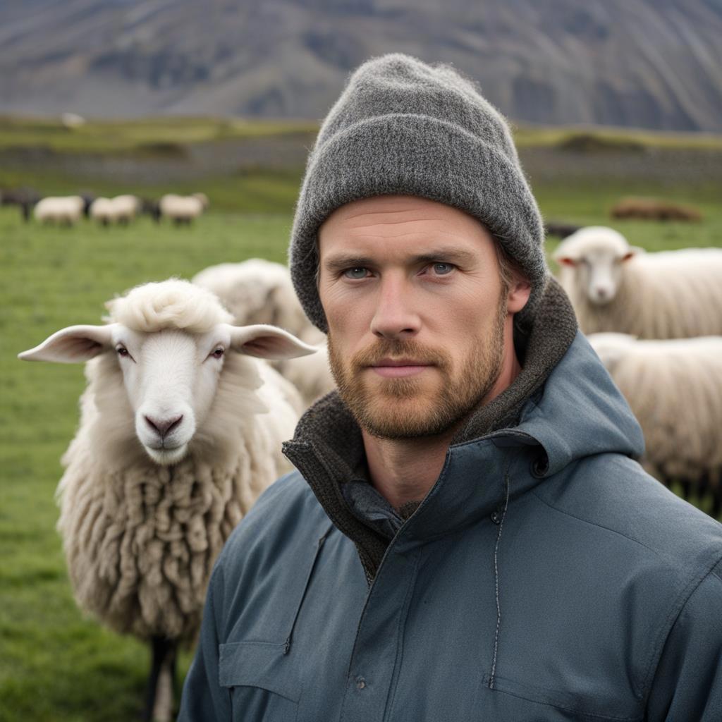 Задача была простая: симпатичный исландский фермер с овцами. Без какого-либо референса. (Не драконов с принцессами же мне рисовать, а викингов и так много было.) (Впрочем, первое слово в промпте было лишним. Несимпатичных исландских фермеров Mage не рисует категорически.