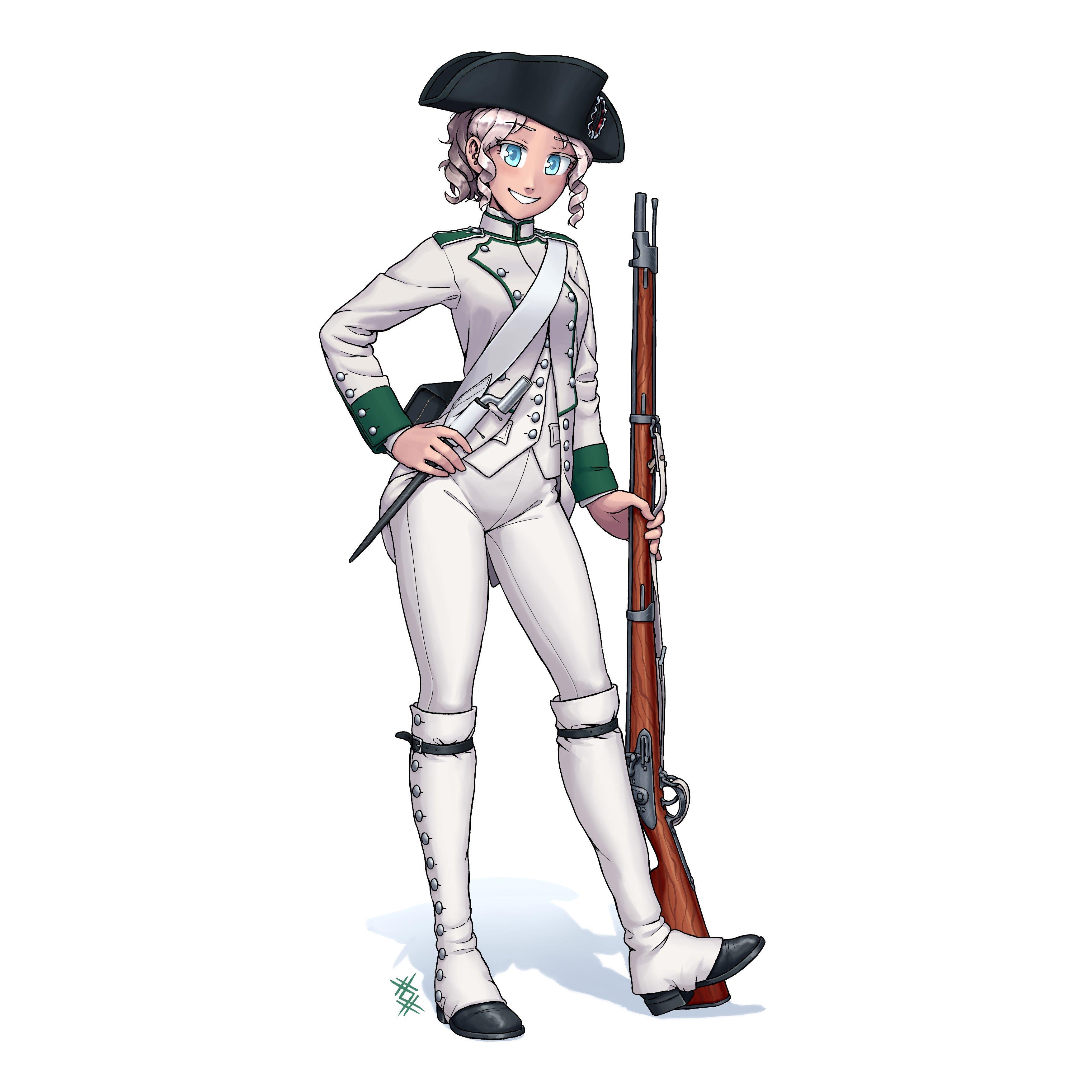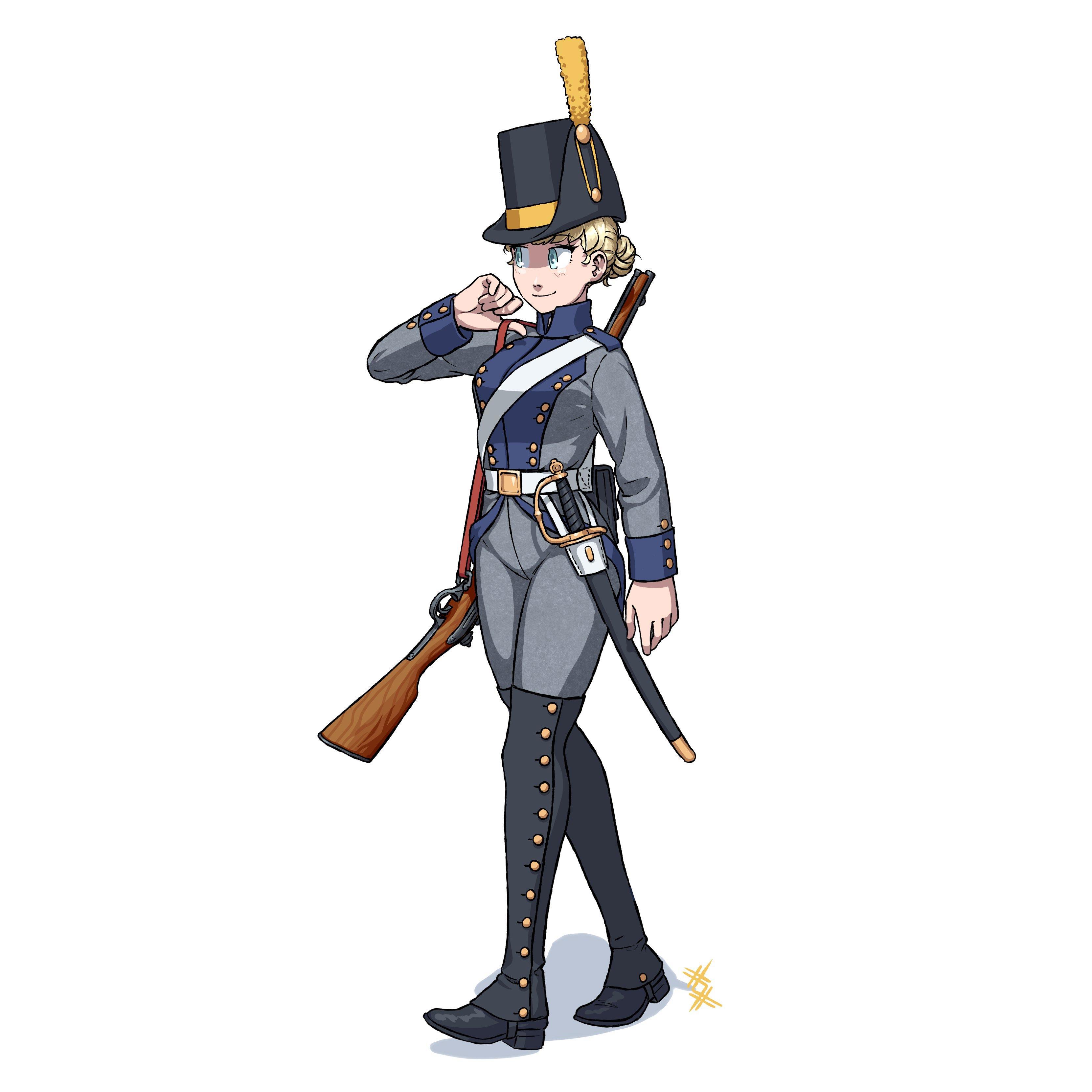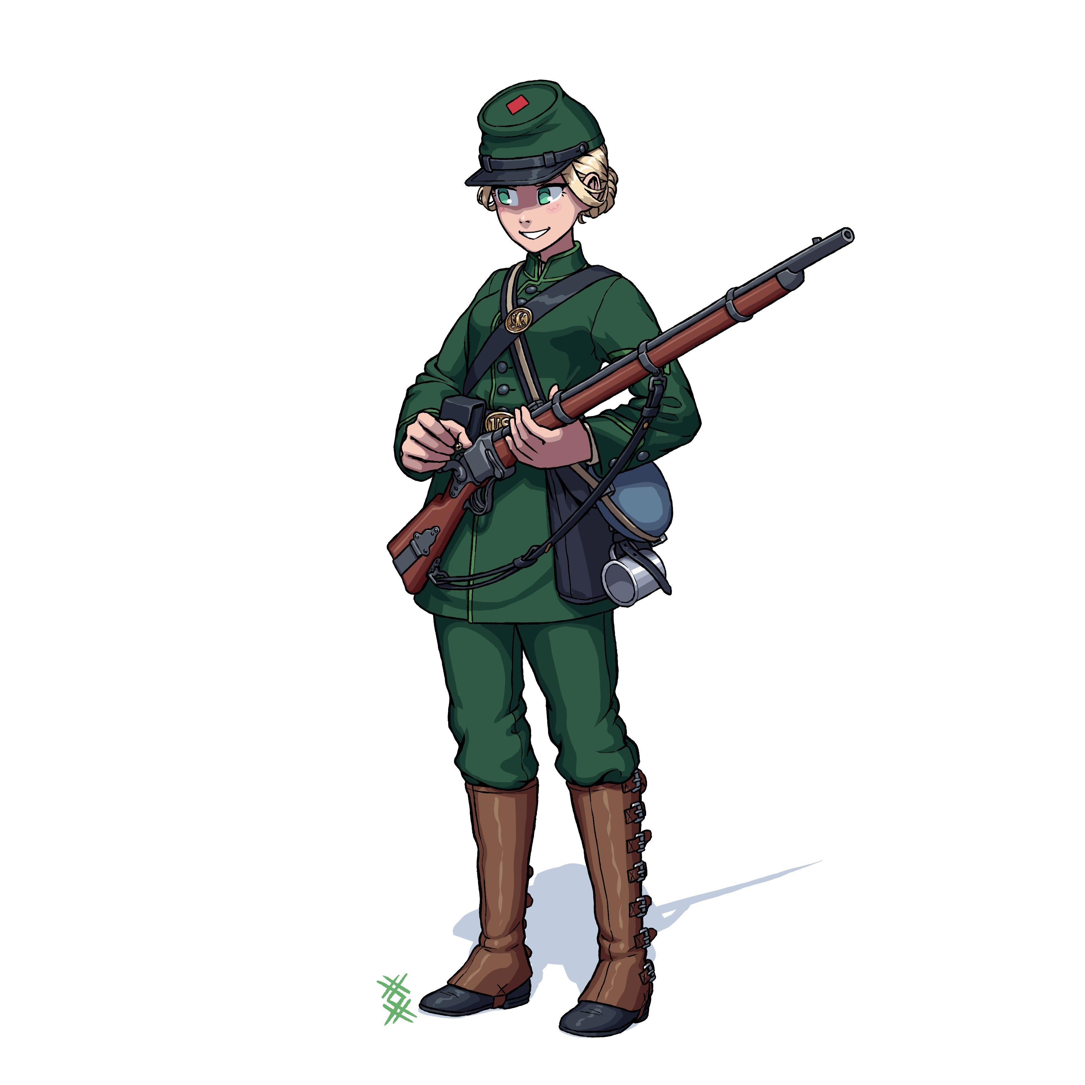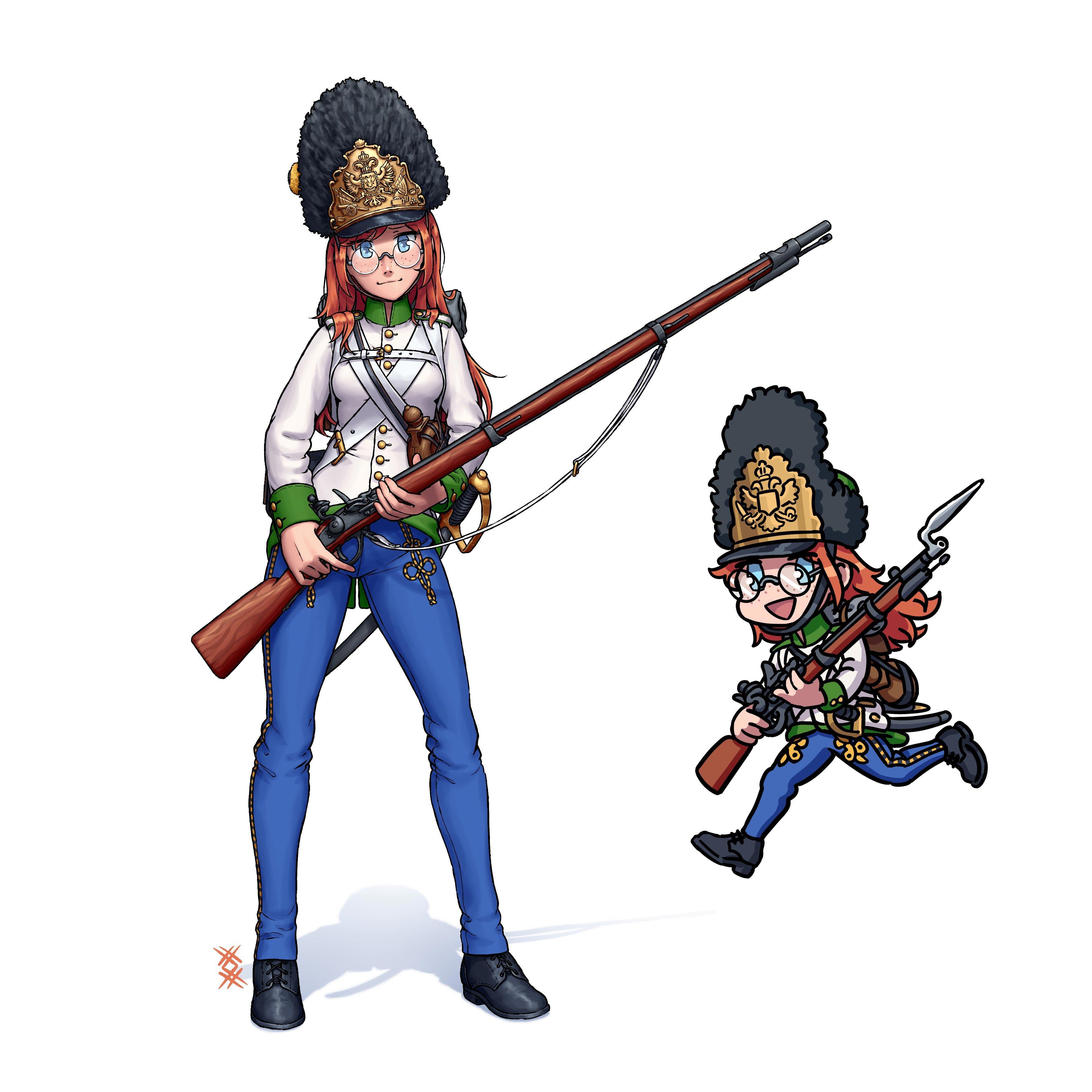 Но также автор часто рисует ростовые портретики разных военизированных девушек, как исторических, так и не очень. Примеры последнего...
