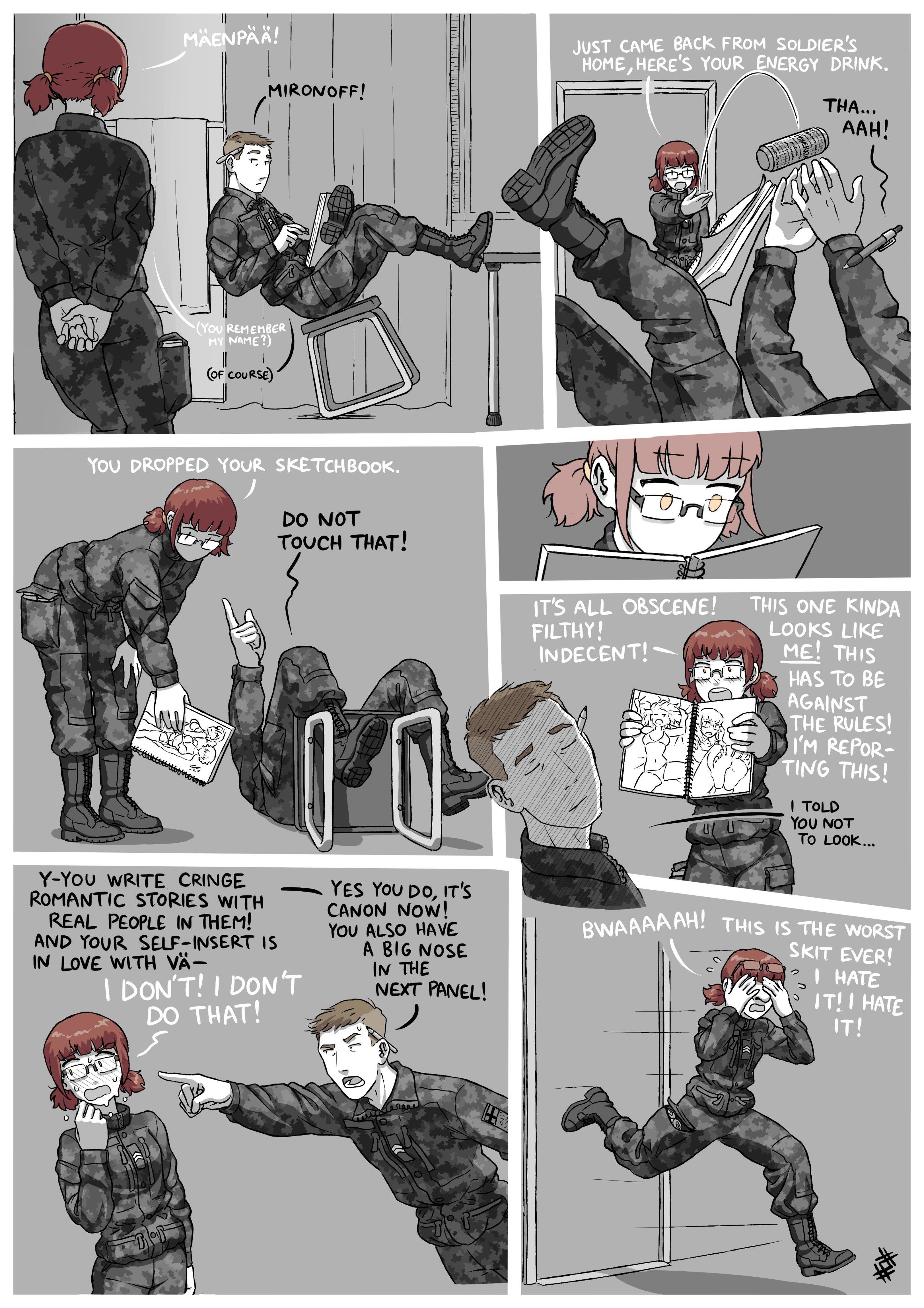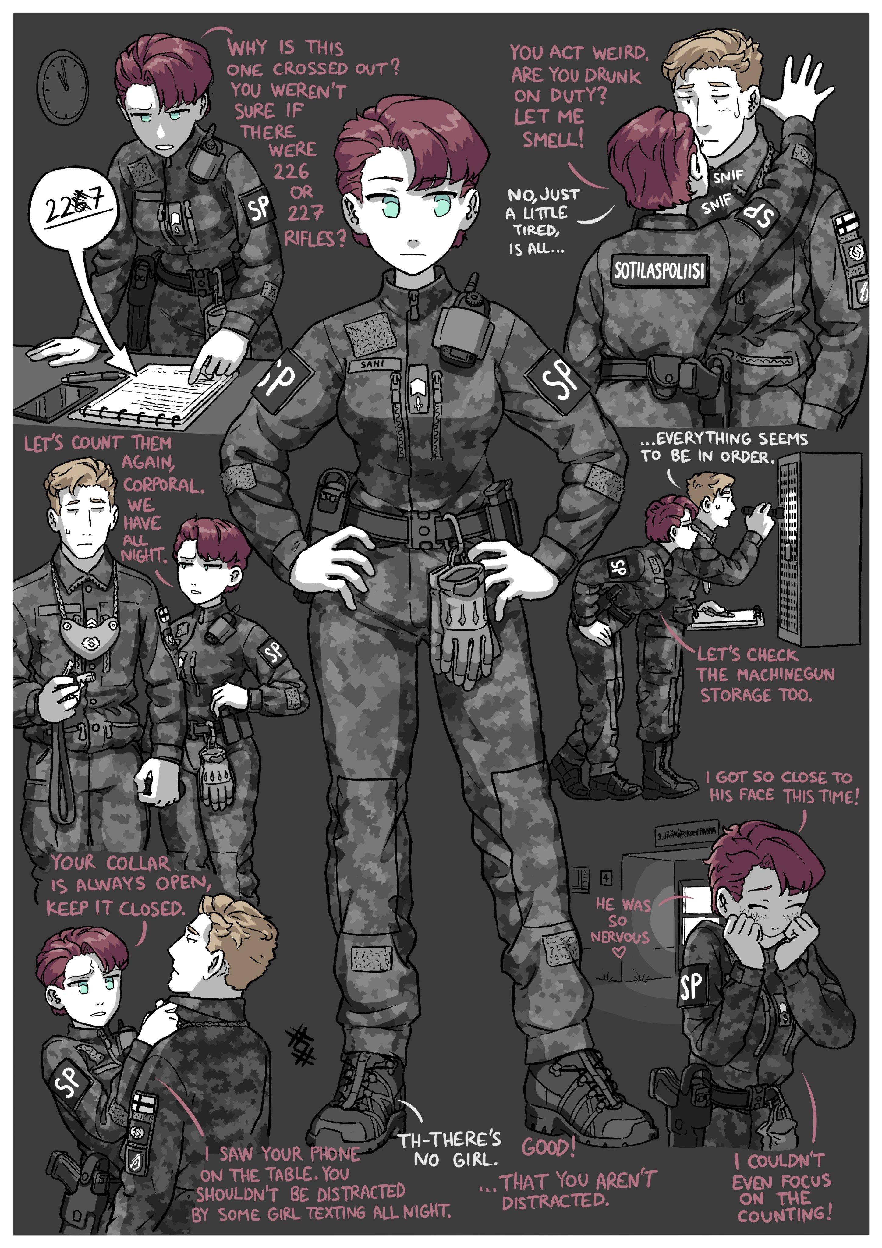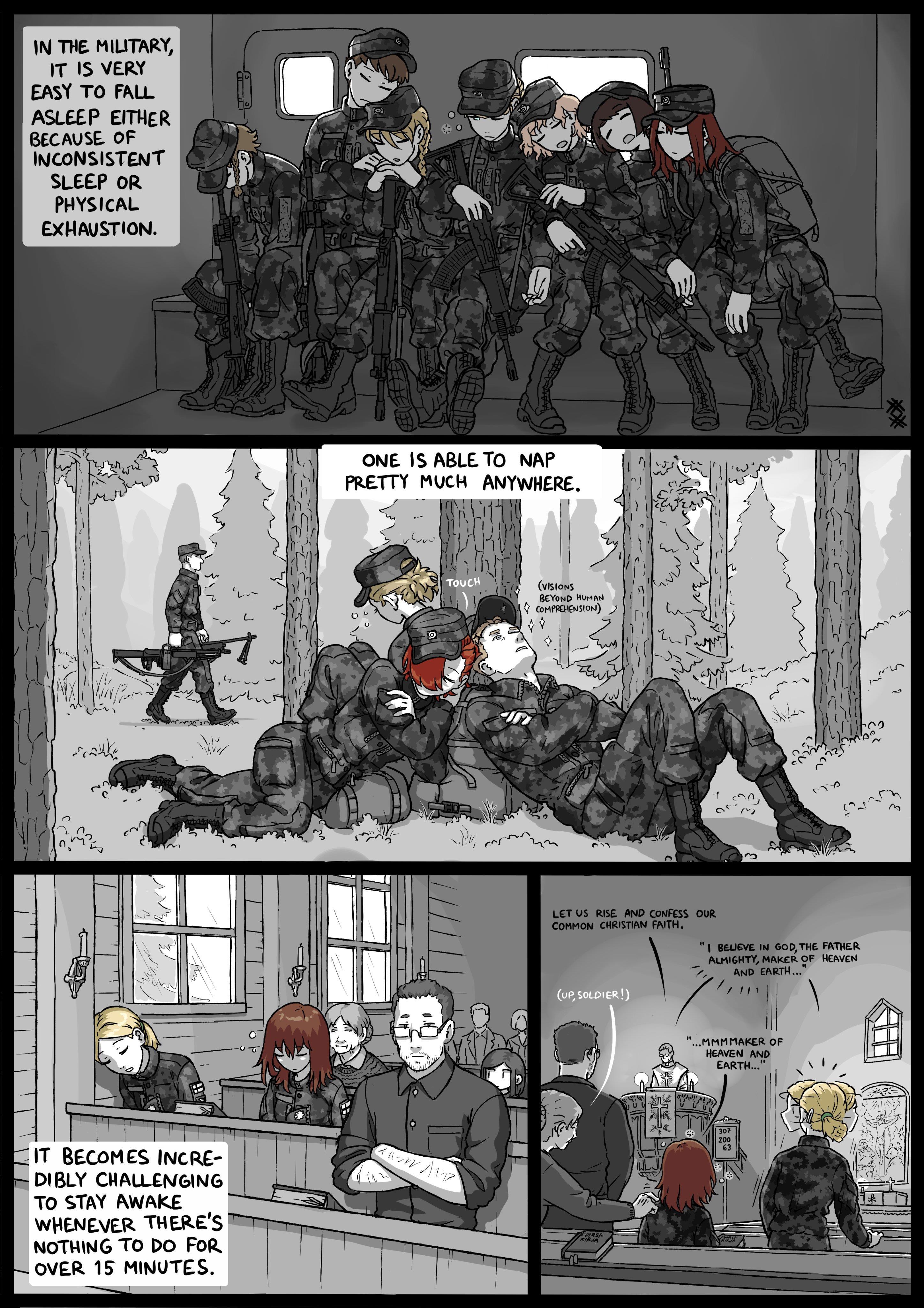 Автор: Руслан БирюшевТак как уважаемой публике понравились рисунки финского художника hero of groznyi о няше-феодаляше, то принесу ещё немного его работ. Основное творчество автора посвящено быту современной финской армии, в основной - службе там девушек. Вот самая свежая страничка. Как говорится - солдат спит, служба идёт или о выработке рефлекса "15 минут без движения - спать".