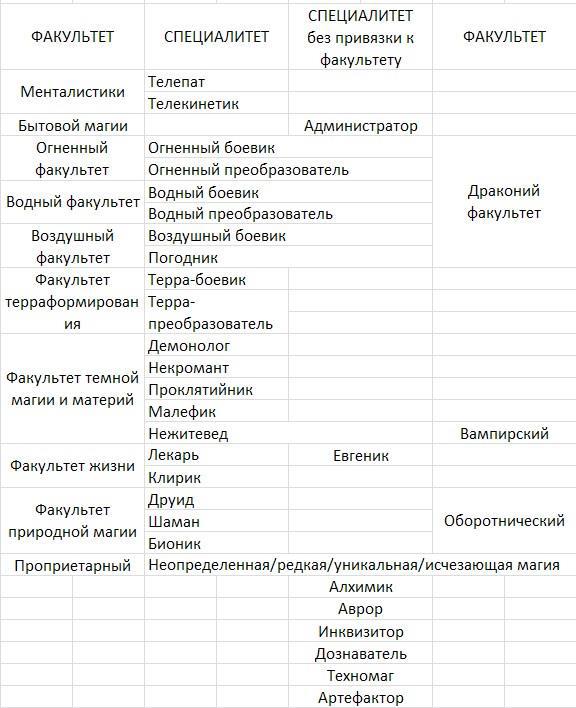 Вот то, что у меня есть. Известны ли вам какие-то интересные виды магического дара или магических профессий, которые можно добавить в программу обучения?