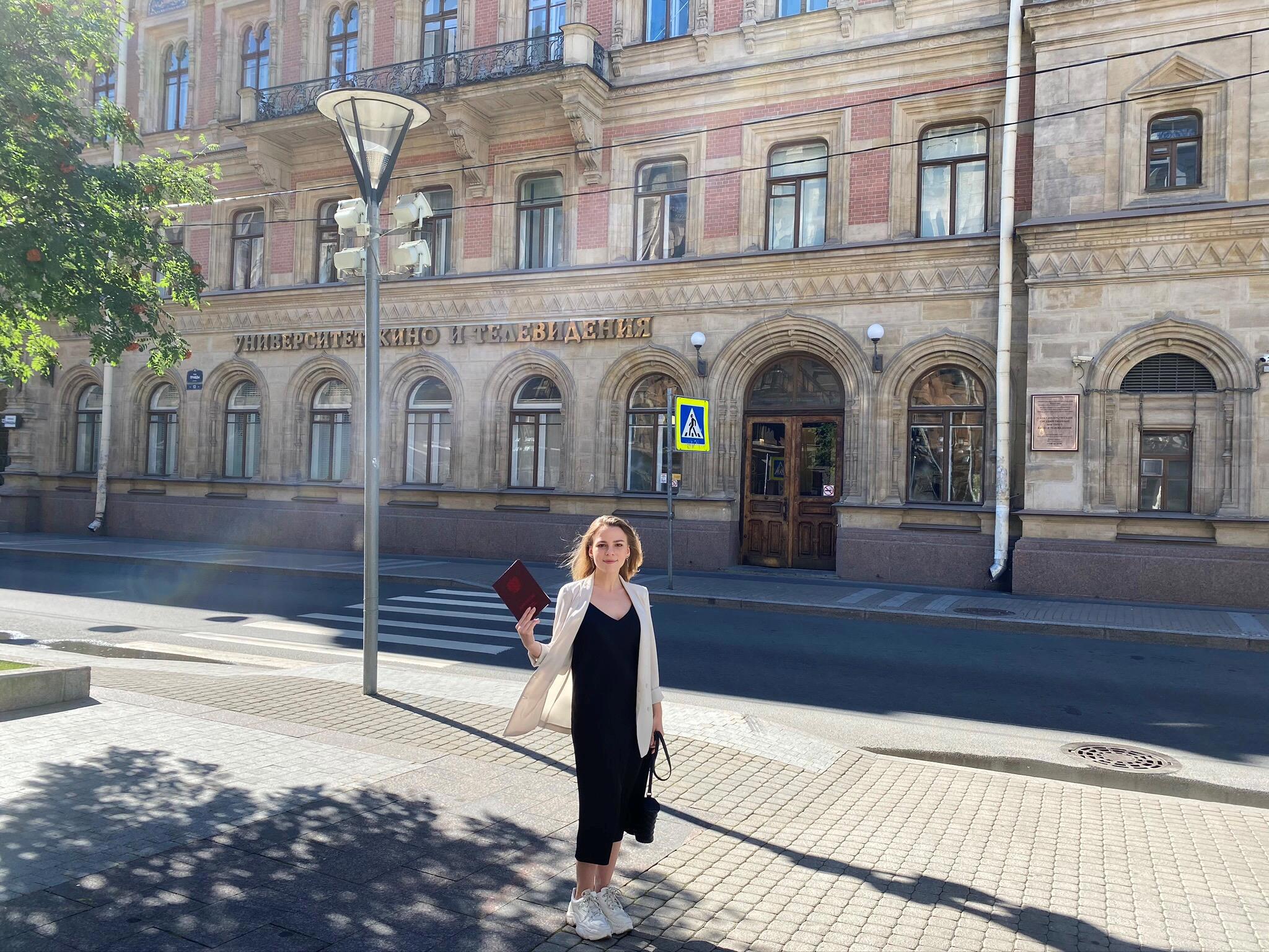 Долгое время меня очень забавляла эта постановочная фотография, ведь в моих руках красный диплом по специальности: режиссер документального кино. Но теперь я вижу, что никакой постановы нет: я - настоящая, диплом - тоже настоящий и вполне заслуженный, вуз - настоящий и до сих пор действующий.