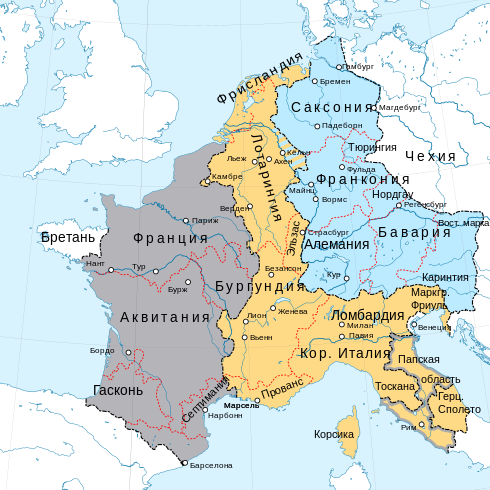 Империю разделили на три части: Франция и Аквитания — Карлу;