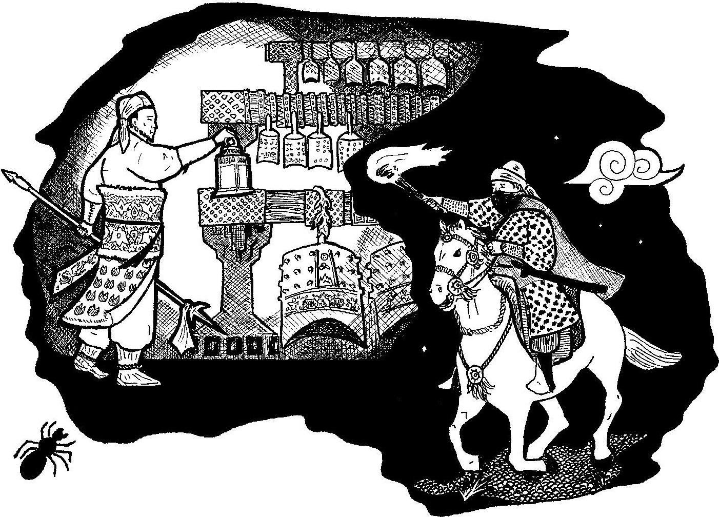 Чиркнуло огниво, и робкий огонёк высветил золотые иероглифы на лице Айго. «Запла́тите позже!» — вдруг бросил тот же голос, и вооружённые оборванцы стремительно оттеснили нас вглубь пещеры. Сейчас начнётся резня, подумал я — и был сильно удивлён, когда откинулся полог и разбойники вышли наружу. Я различал только мелькание фигур и слышал чавкающие удары копий и щёлканье арбалетов, но понимал: они уничтожают гуйшэней. Когда с этим было покончено, наши неожиданные защитники отступили от выхода, как бы приглашая и нас покинуть пещеру.