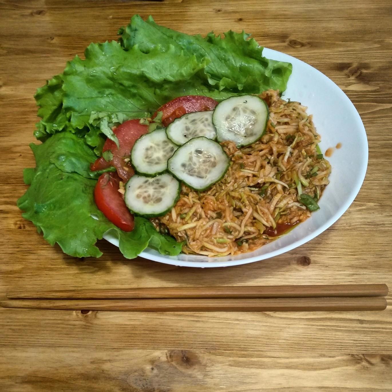 Автор: Сергей ВарлашинЦуккини, огурцы, томаты, листья салата, сок лимона, укроп, масло холодного отжима.