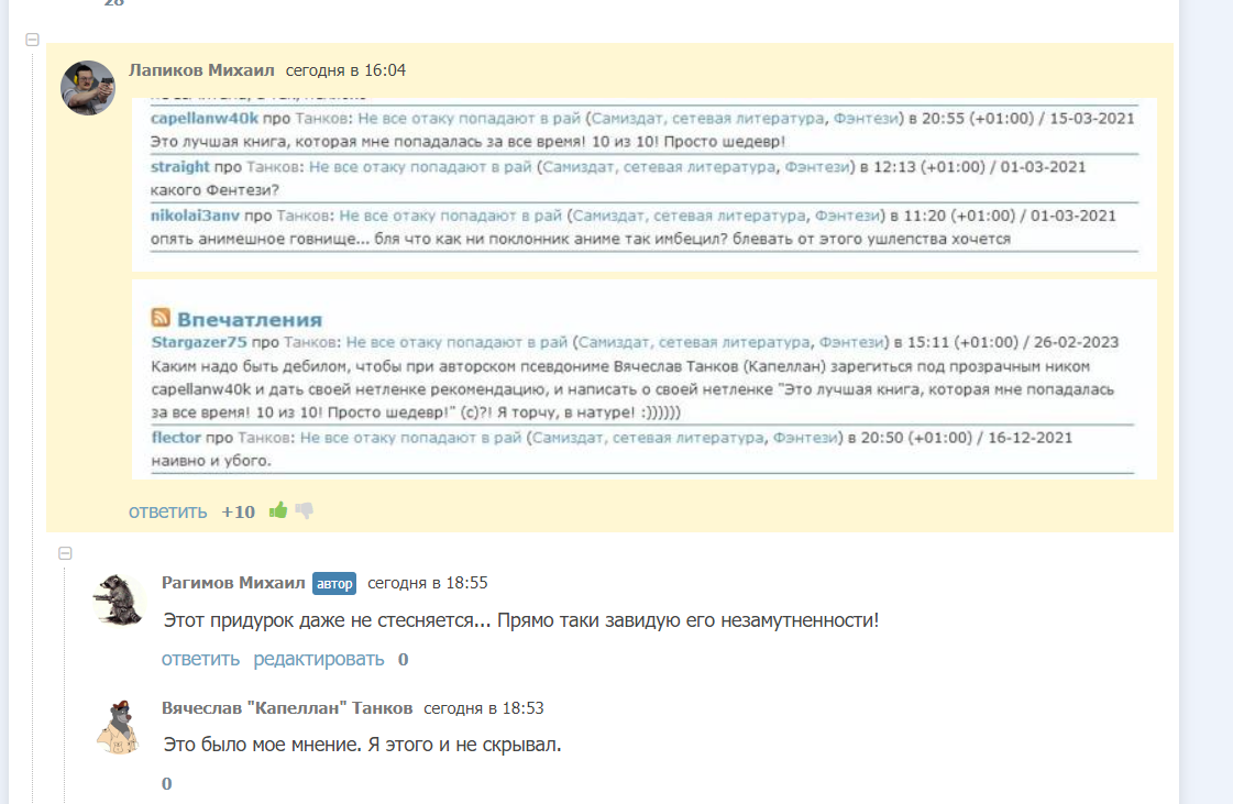 Или вы думаете, что вы ваяете гениальную нетленку?) Вы же, в массе своей, суть графоманы, неспособные ни на оригинальность, ни на качество исполнения.