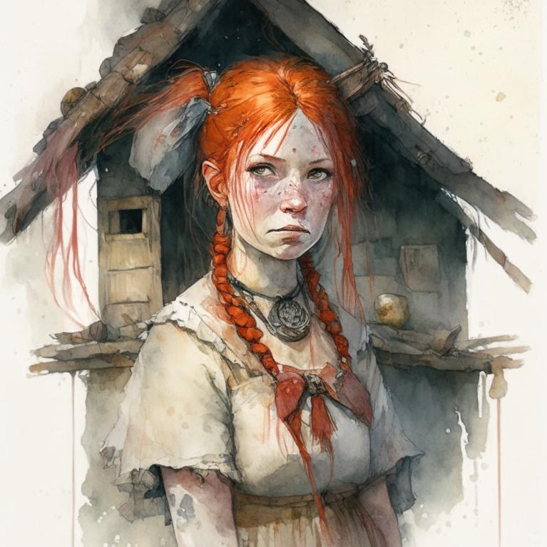 Вдруг амбар осветился мягким золотистым сиянием, а позади послышался скрип и смущенное покашливание. Домовой обернулся и увидел девушку с ярко-рыжими волосами, заплетенными в две косички. Впрочем, многочисленные вихры выбивались из них и торчали в разные стороны. Большие зеленовато-серые глаза испытующе смотрели из-под густых ресниц. На ней была пестрая шерстяная кофта, длинная юбка и сапоги, и судя по комьям снега, она только что вернулась со двора.