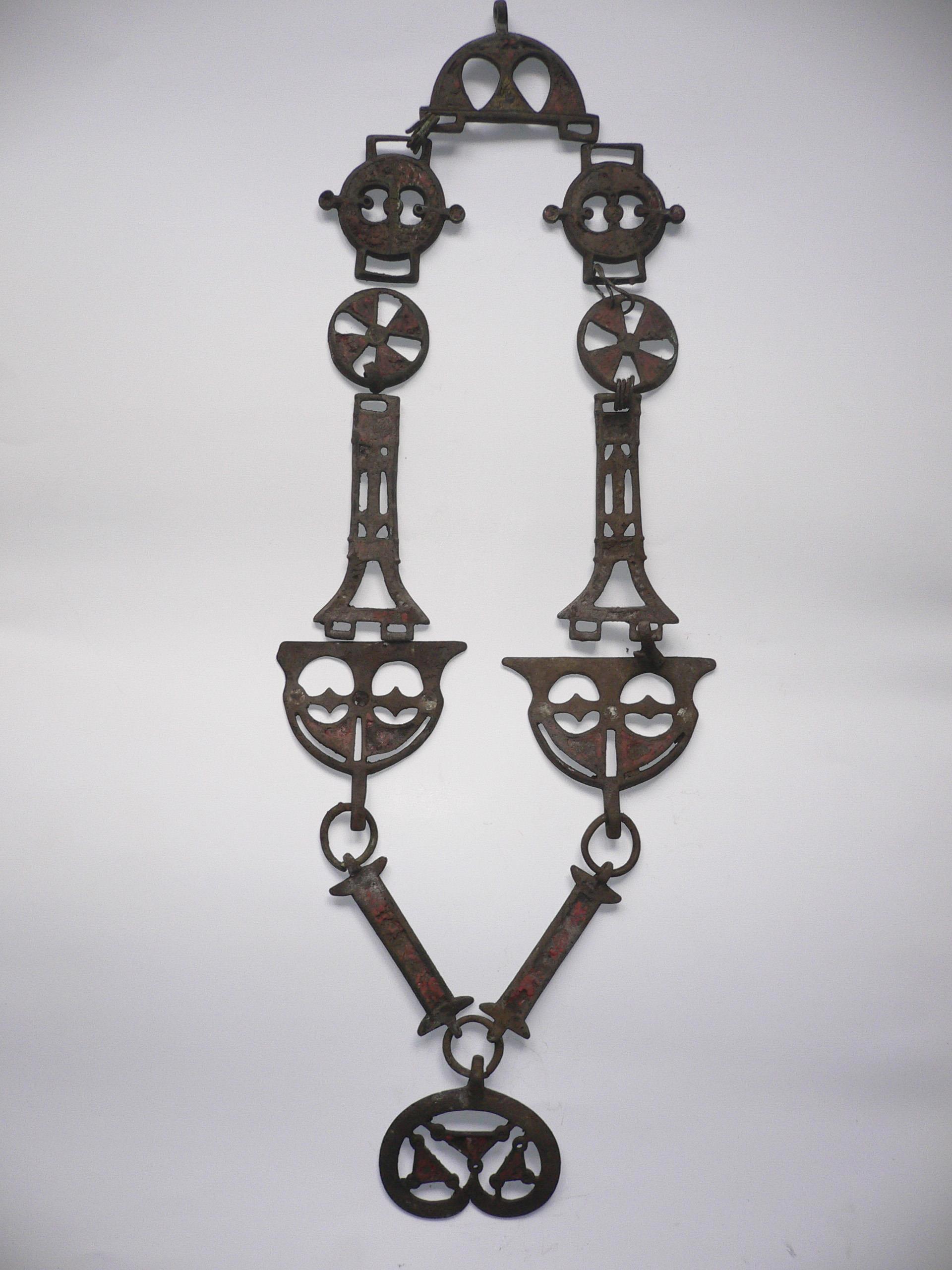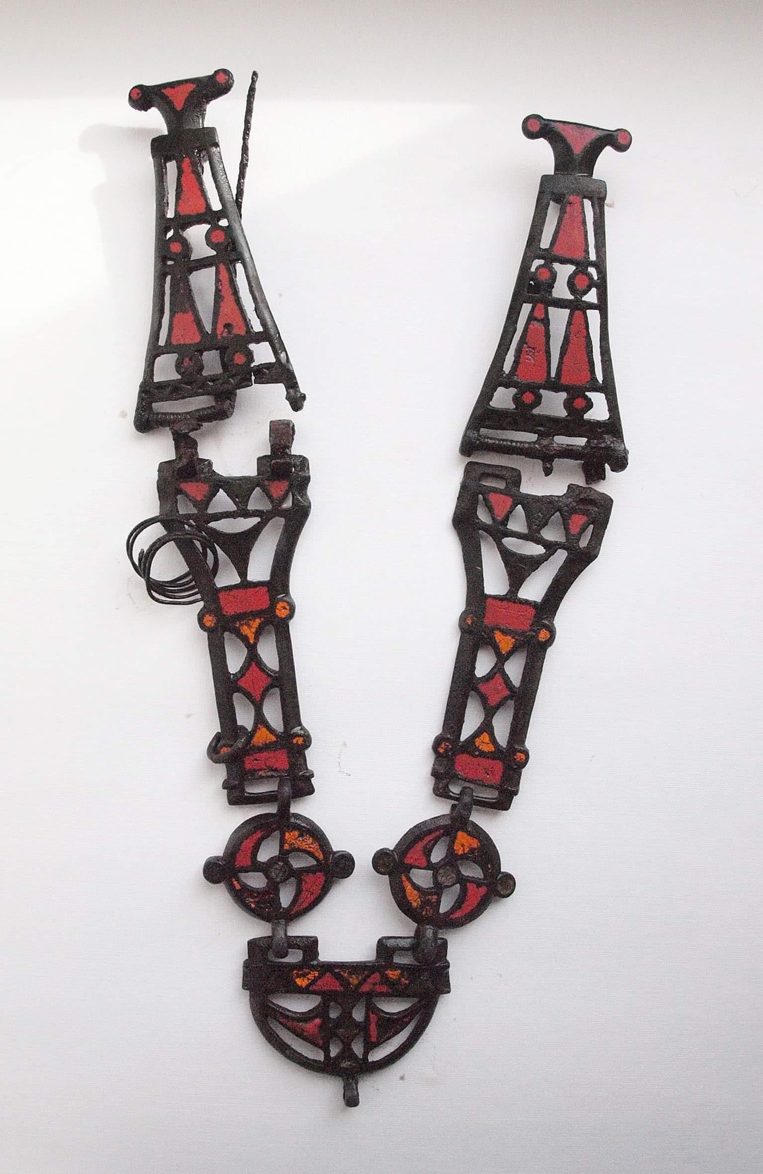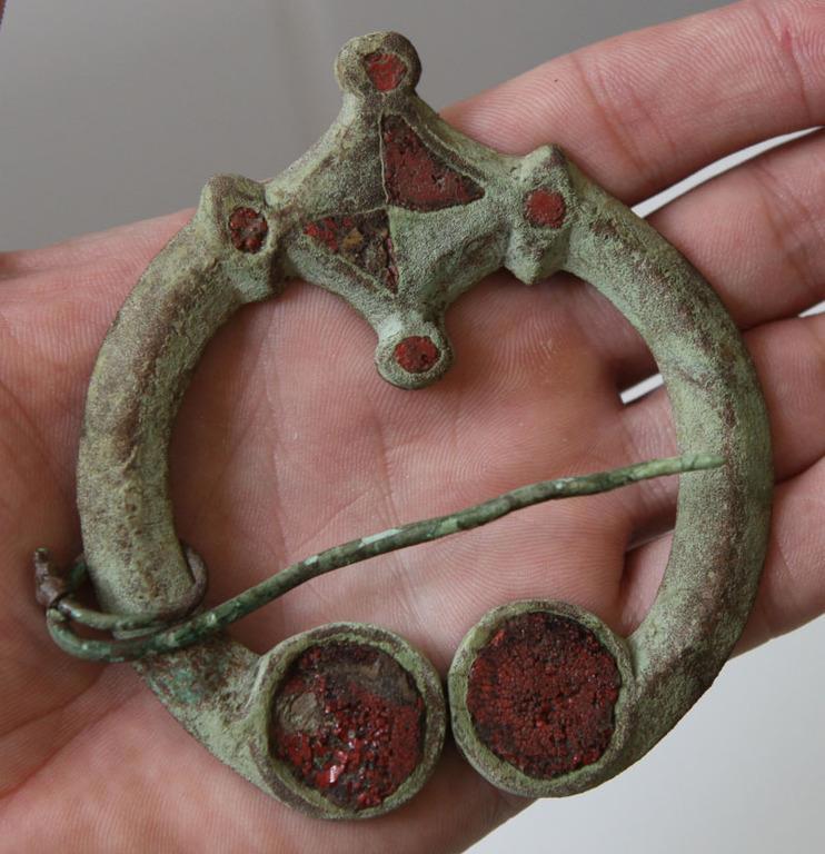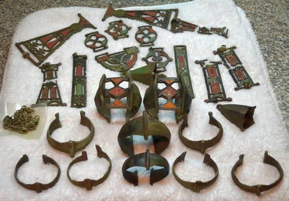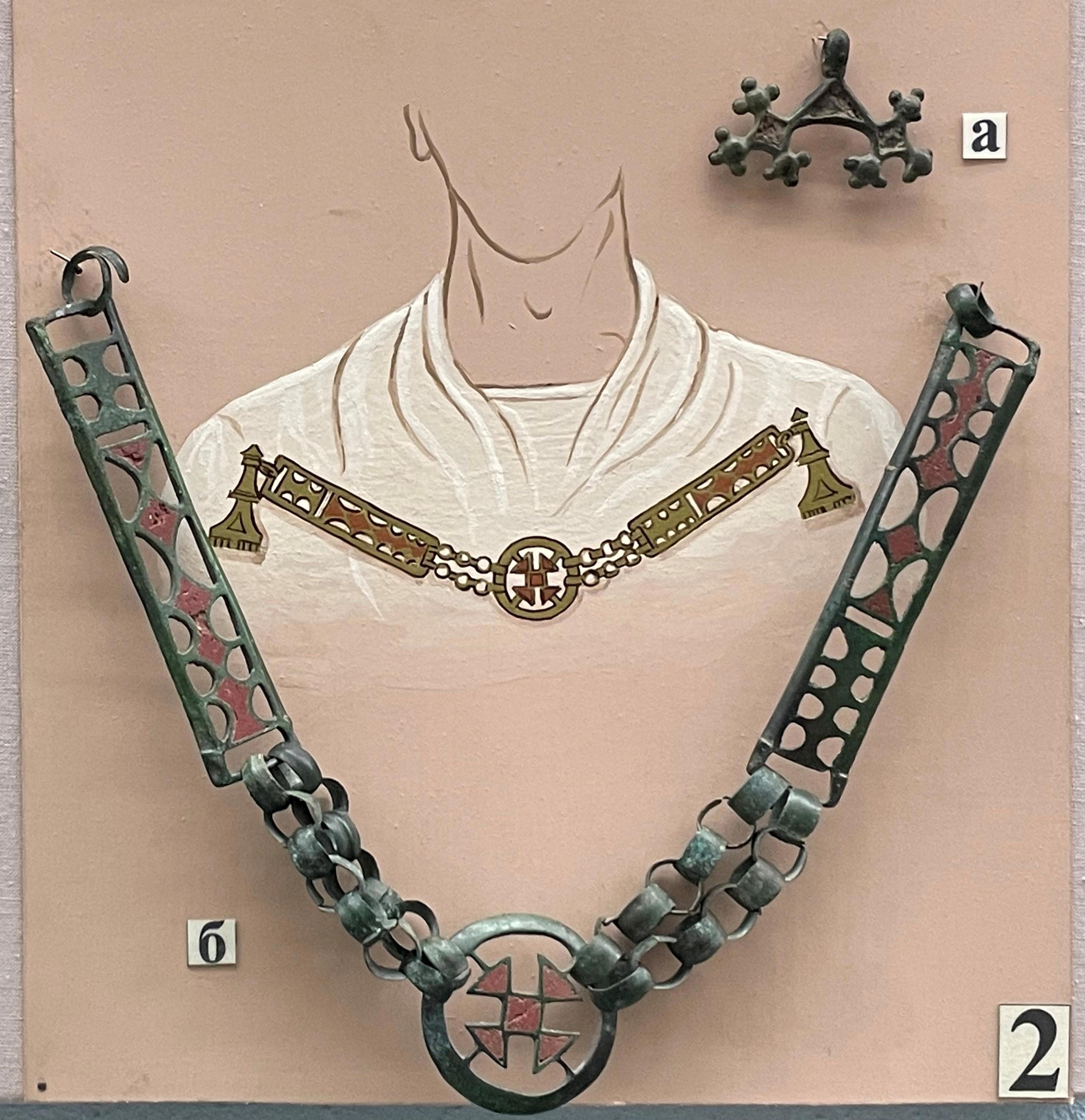 Судя по тому, что находки оружия на этой территории крайне редки и представлены в основном копьями и наконечниками стел, народ здешний был миролюбив. Но есть у Киевской культуры одна черта, которая сильно выделяет ее на фоне соседних. Речь идет о т.н. выемчатых эмалях. Что это такое? Представьте себе бронзовое украшение, в нем сделана выемка, заполненная цветной эмалью. Предметы такого рода выглядят очень эффектно, даже богато. Шикарно смотрелся женский костюм, украшенный фибулами, лунницами и нагрудной цепью. Судите сами.
