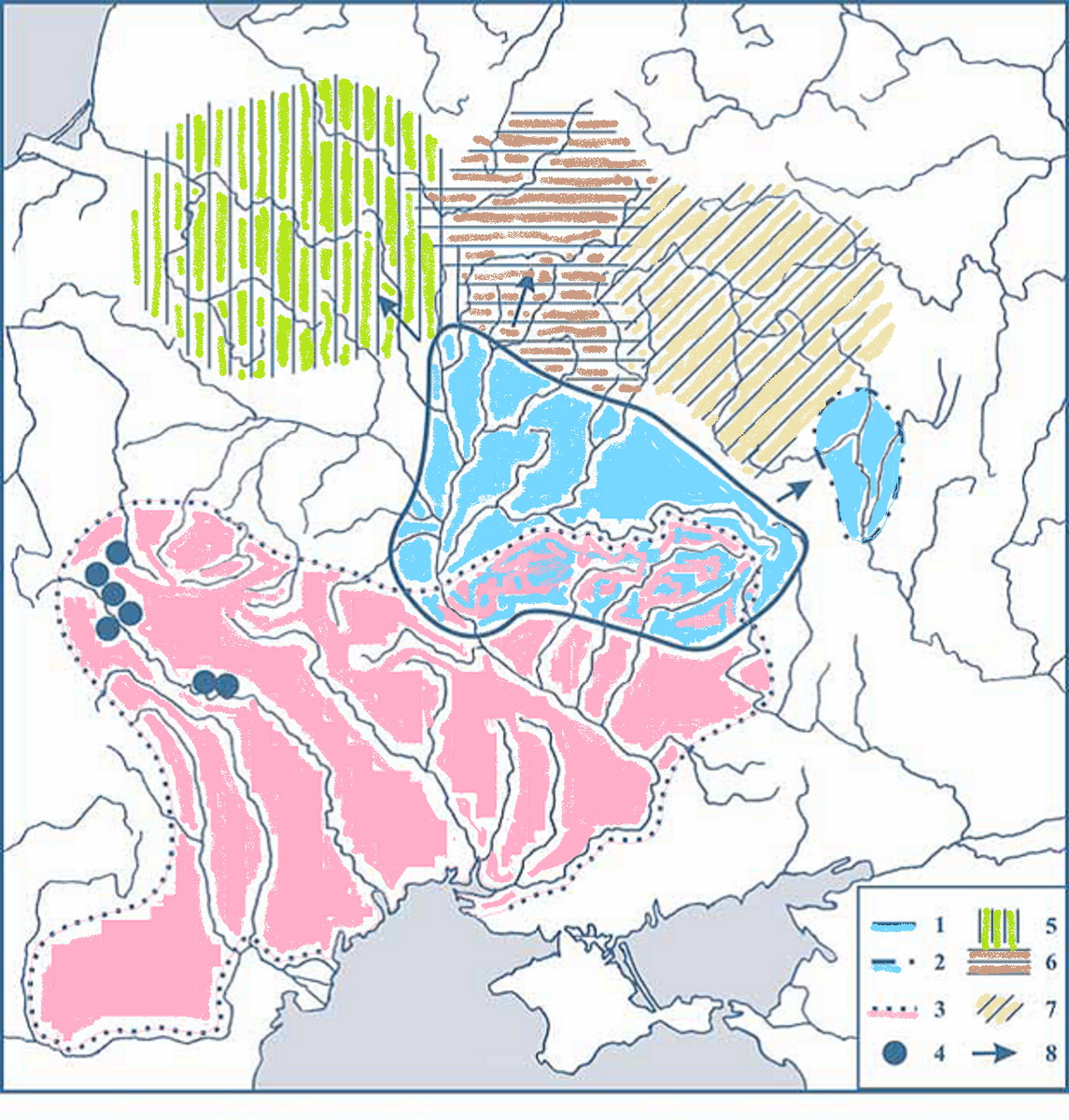 Киевская культура изображена голубым цветом. Она относится к числу тех культур, синтез которых и дал нам восточных славян, а в последующем Русь. Киевская культура существовала во II-V вв., пережила синхронную ей черняховскую культуру ( розовый цвет) и гуннское нашествие. Последнее удалось благодаря тому, что Киевская культура не была так глубоко интегрирована с Северепричерноморскую торговлюи не имела прочных связей с приграничными римскими провинциями. В целом Киевская культура имела архаический облик. Посуда была примитивной, лепной.