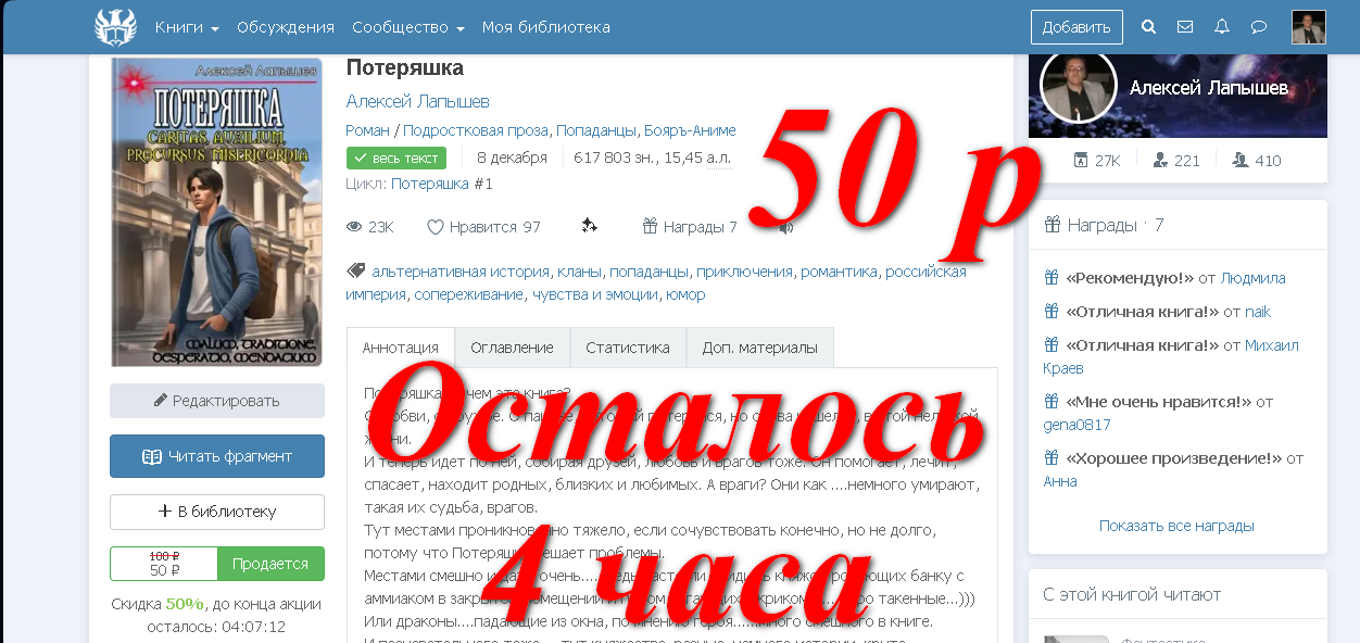 Автор: Алексей ЛапышевсДоброго вечера друзья и подписчики, на всякий случай......на Потеряшке действуют скидки 50% и цена всего 50р.
