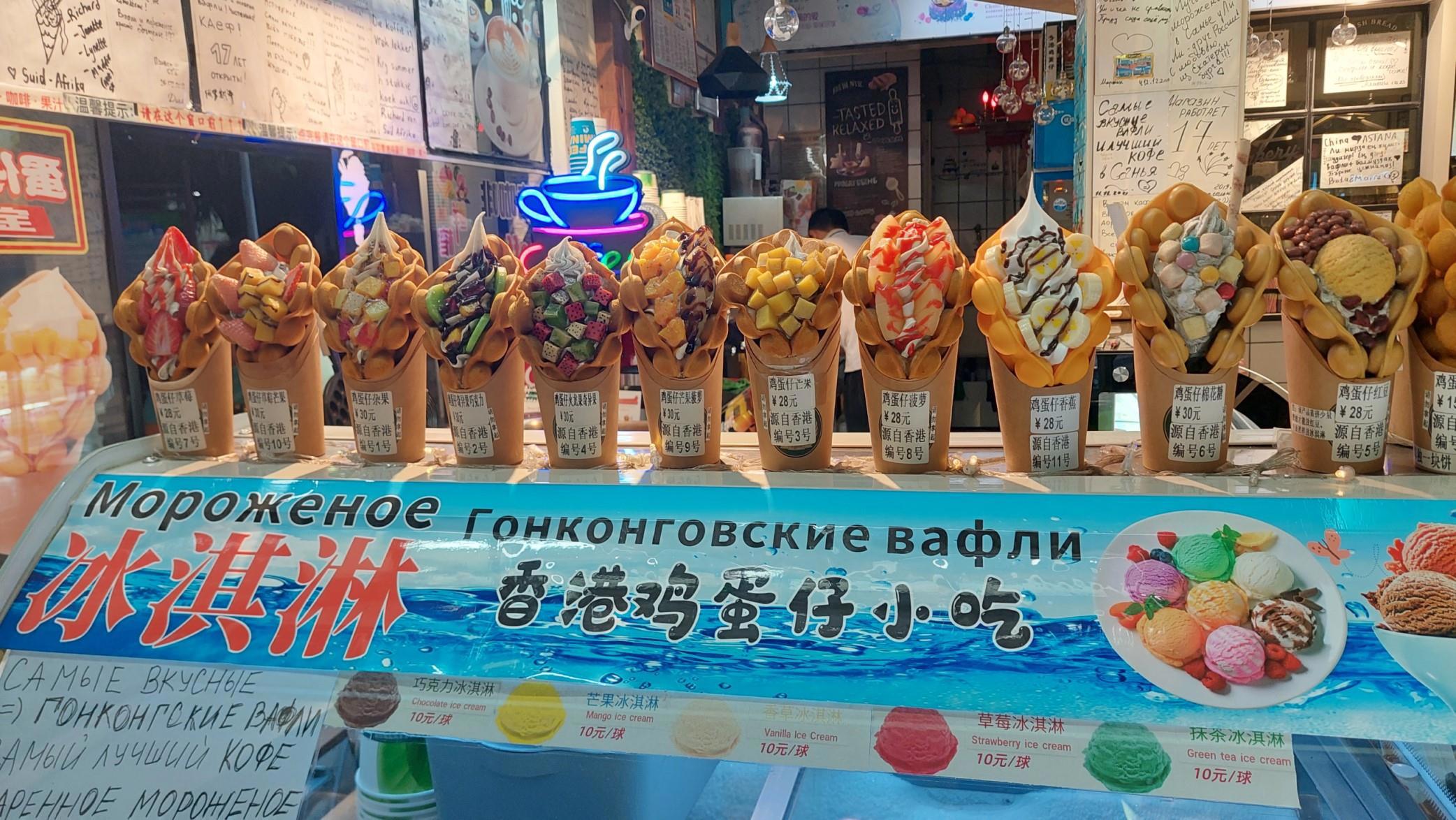 Другой десерт — это «Гонконгская вафля». Вафля тут же жариться, скручивается в широкий рожок, остужают, заполняют мороженным, сверху сливки, и туда же укладываются нарезанные кубики разных, на выбор, фруктов. Вкуснооооо. Ам.