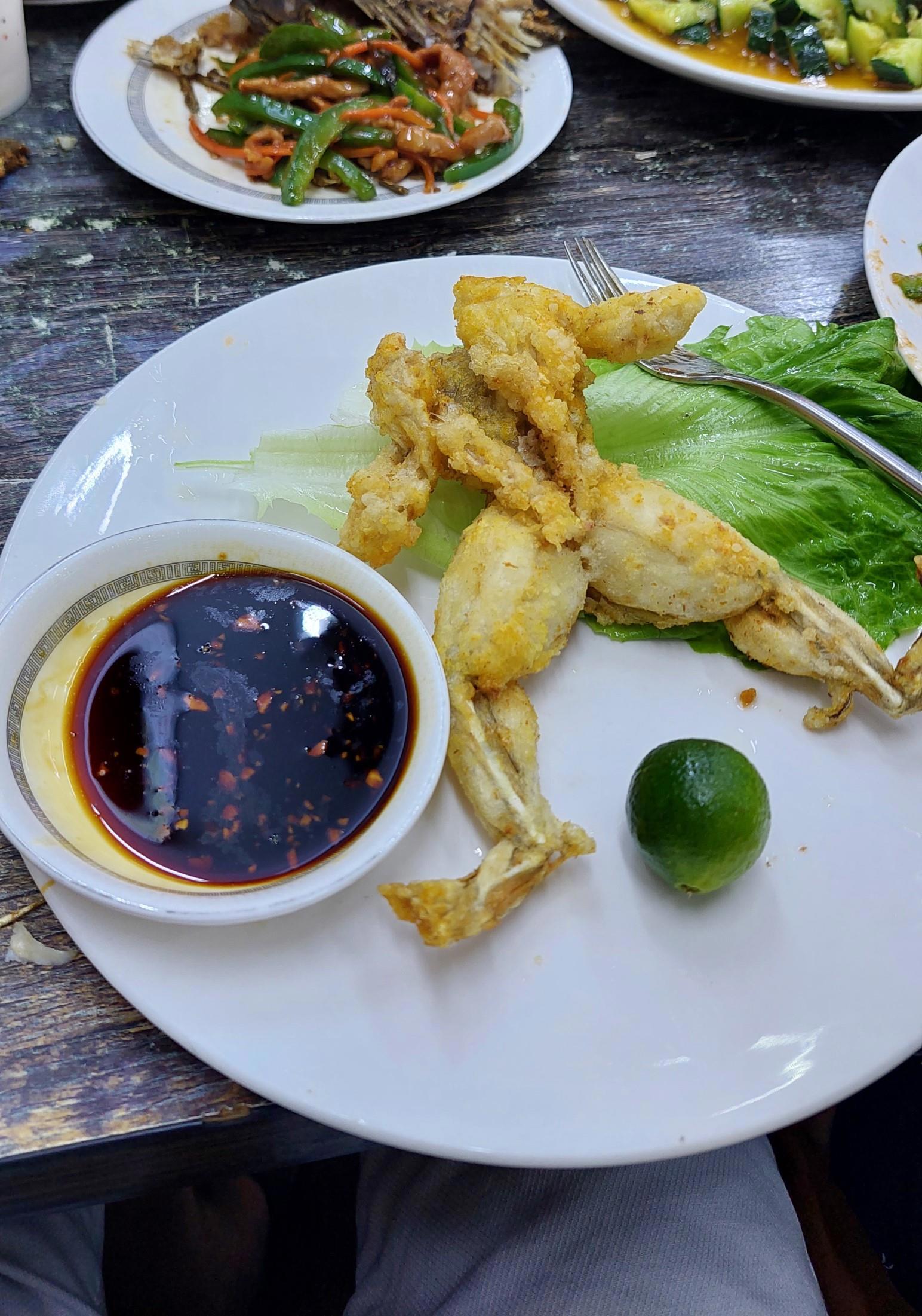 Поужинали, что называется от пуза, заказал лягушку в кляре, прикольно, нежное мясо с предложенным соусом зашло на ура.