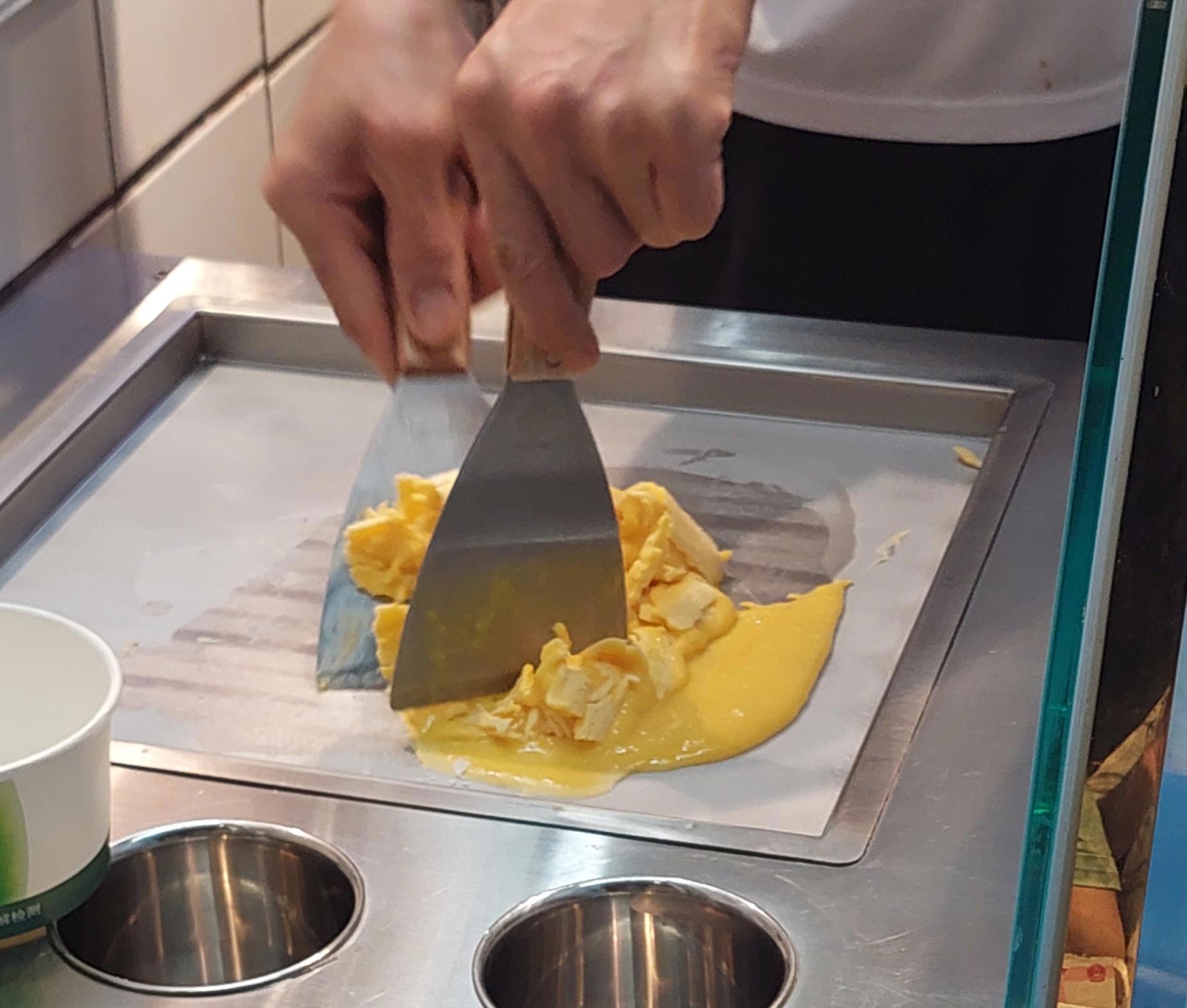Дамам захотелось освежить в памяти вкус «Жаренного мороженного»-смесь свежевыжатого сока манго или другого с кокосовым молоком, остужают, помешивая на сильно охлаждённой поверхности, доводя смесь до состояния мороженного. Порция получается в грамм 300. Прикольно, вкусно.