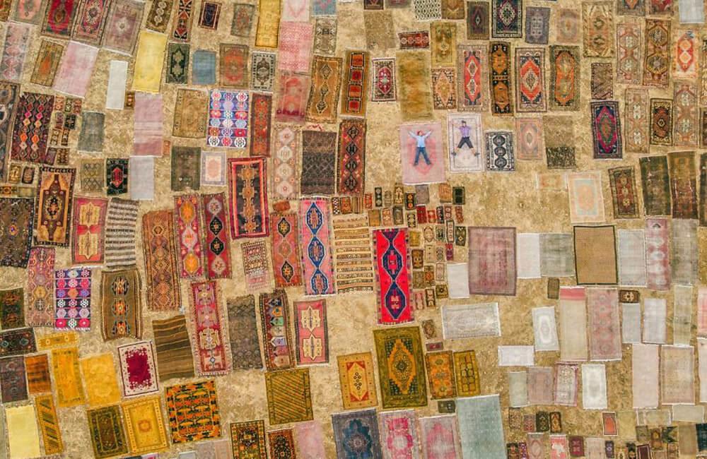 Сотни ковров ручной работы разложены на полях, чтобы подчеркнуть различные цвета с эффектом обжигания солнечными лучами. Пара рабочих ложится на ковры после окончания своей работы, чтобы снять дневную усталость.