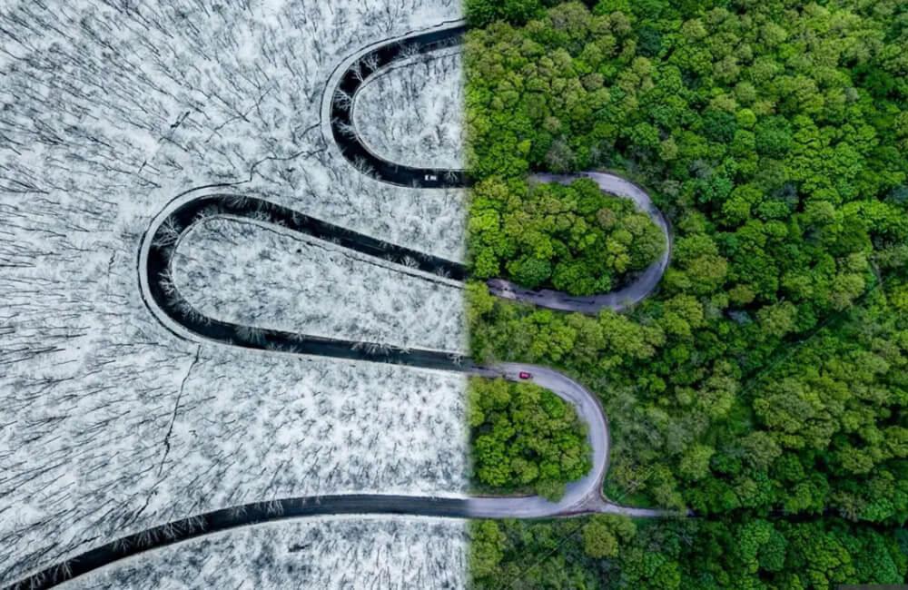 Два в одном. Летняя и зимняя фотографии одной дороги на одном снимке