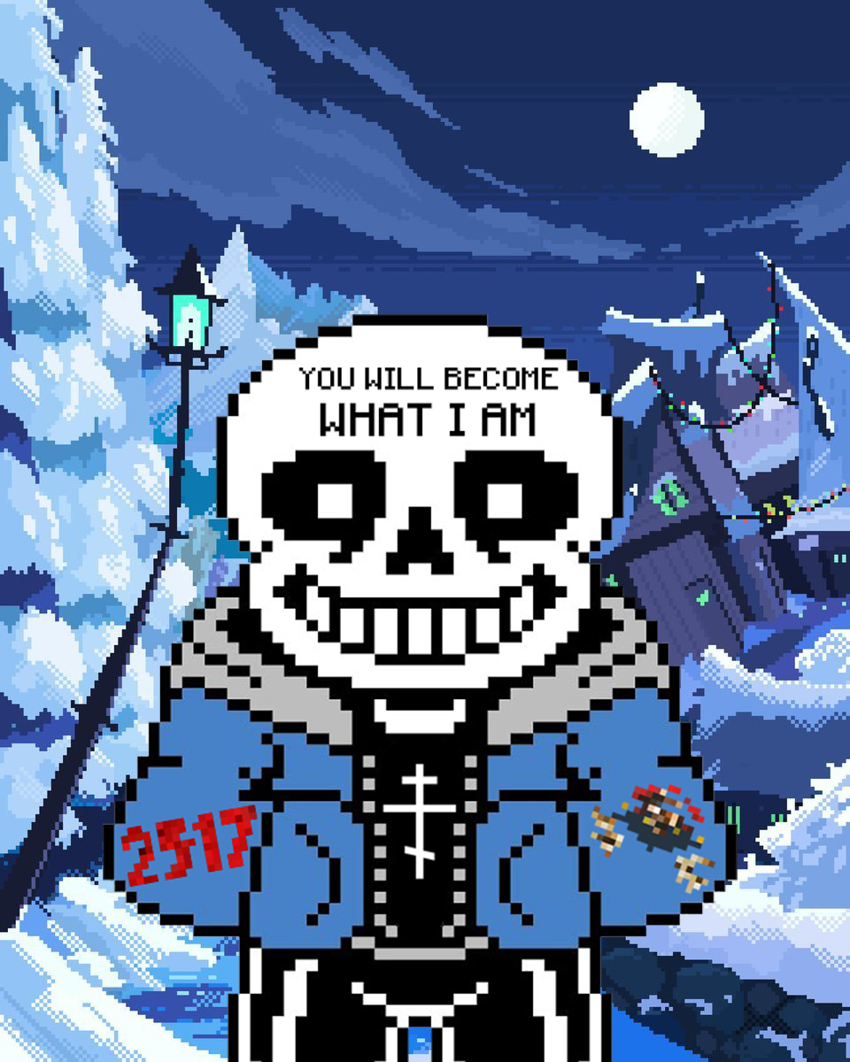 Автор: Варух ТелегинНедавно в чате подкололи текущую аву-фотку (в Телеграм такая же): варух - Санс. В Андер не играл, но над идеей порофлил, и родилось вот такое. Да, на аватарке на черепе такая же надпись.